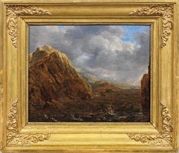 Subtil erfasste, mediterrane, atmosphärisch gestimmte Landschaftsimpression. Motiv, Komposition und Stil zeigen Parallelen zu einer Reihe bekannter Griechenland- und Italien-Bilder Rottmanns, denen eine vergleichbare Landschaftsauffassung eigen ist. Rottmann reiste durch die Unterstützung König Ludwig I. 1826/27 nach Italien und schuf in dessen Auftrag einen 1883 vollendeten Zyklus monumentaler italienischer Landschaften. 1834 erhielt Rottmann vom König den Auftrag zu einem zweiten, nun den Landschaften Griechenlands gewidmeten Zyklus, der schließlich 23 große Landschaftsbilder in der neu erbauten Neuen Pinakothek umfasste. Zu diesem Zweck reiste Rottmann 1834 für 14 Monate nach Griechenland, die vor der Natur entstandenen Studien zeigen eine vergleichbar summarische Behandlung des Motivs und einen im Duktus ähnlich freien Einsatz der Farbe. 1841 wurde er vom König zum Hofmaler ernannt. Öl/Lwd., doubl.; 22 cm x 27,5 cm. Rahmen.