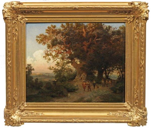 Blick auf monumentale Eichen am Bantelner Weg bei Gronau, belebt durch einen kleinen Trupp von Landsknechten des 17. Jhs., im Hintergrund die Marienburg. Von Johann Wilhelm Schirmer beeinflusste, seltene Landschaft Klemmes, der mit Wilhelm Busch befreundet war und seit 1850 an den Kunstakademien in Düsseldorf, Antwerpen und München studierte. Öl/Lwd.; L. u. sign.; Verso auf altem Etikett betitelt u. bez. "A. Klemme in Hannover". 40 cm x 50,5 cm. Rahmen.