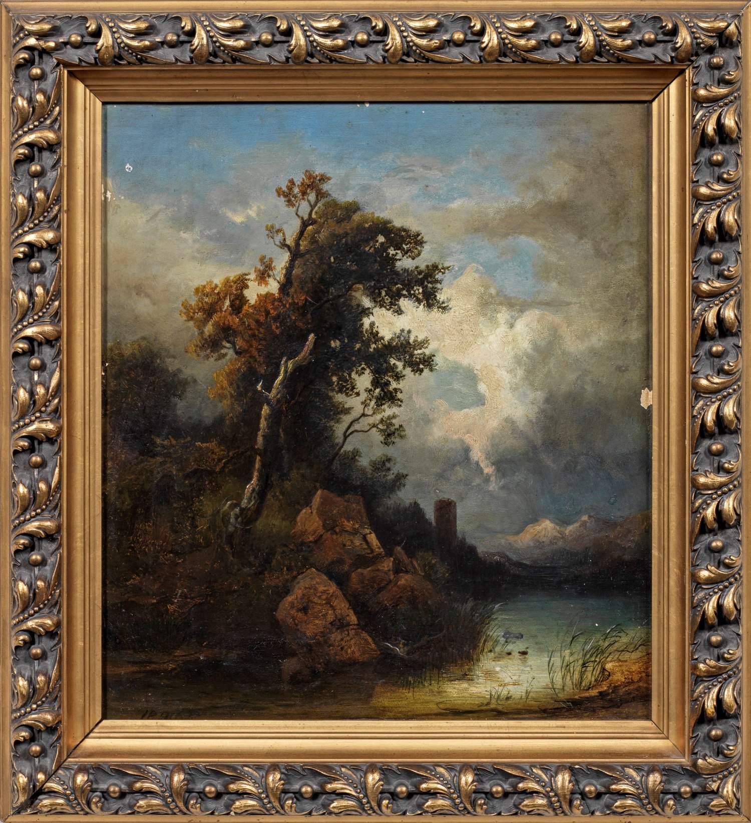 Spätromantische Landschaft. Öl/Malkarton. L. u. monogr. "K" u. dat. 1863 (oder 1865). Verso alte Sammler-Besitzerinschrift des Architekten Adolf Narten, mit Adresse in Hannover, 2. Hälfte 19. Jh.; Ger. Farbabplatzungen. 36 cm x 33 cm. Rahmen.