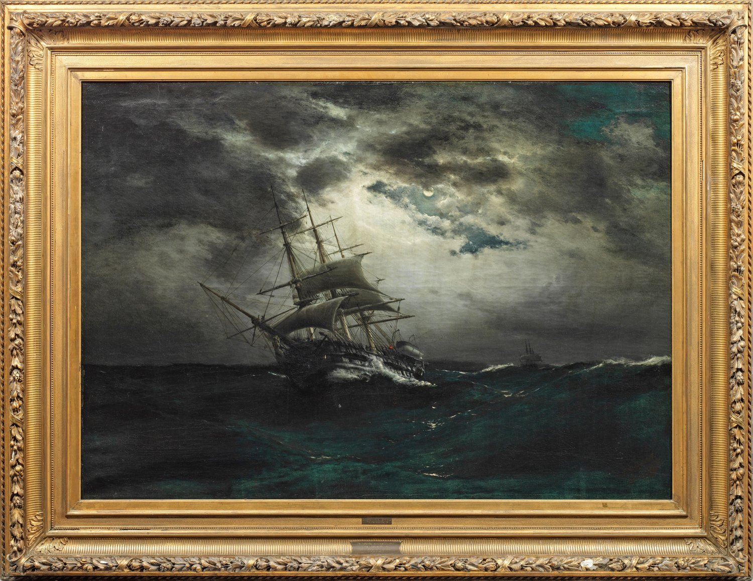 Darstellung des historischen, dänischen, dreimastigen Kriegsschiffes auf hoher See im Mondschein - die "Christian VIII." war ein dänisches Linienschiff, das während des Schleswig-Holsteinischen Krieges 1849 zerstört wurde. Großes, frühes, 1885 in Hamburg entstandenes Hauptwerk des Marinemalers, der 1886 Meisterschüler von Hans Gude an der Berliner Kunstakademie wurde. 1887 debütierte er mit dem Gemälde "Marine (vor Sonnenaufgang)" in der Jubiläums-Ausstellung der Kgl. Akademie der Künste in Berlin; seitdem beschickte er häufig und erfolgreich die Akademie-Ausstellungen, Großen Berliner Kunstausstellungen sowie Ausstellungen in Wien, Bremen etc.; 1890 erwarb Kaiser Wilhelm II. das in der Akademie gezeigte Gemälde "Hilfe in Sicht". 1891 gründete Schnars-Alquist mit Max Liebermann, Walter Leistikow und anderen die "Vereinigung der XI". 1896 wurde er zum Professor ernannt und ging 1898 von Berlin zurück nach Hamburg. Öl/Lwd., R. u. sign. u. dat. 1885 mit Ortsangabe Hamburg. 128 cm x 181 cm. Originalrahmen.