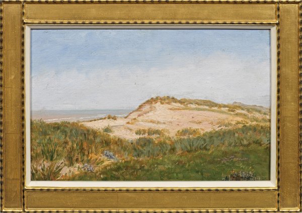 Sommerliche, atmosphärische Landschaftsimpression, die in ihrem lockeren Duktus, dem leuchtenden Kolorit und der feinfühligen Wiedergabe der Stimmung treffend dem Oeuvre Jettels zugeordnet werden kann. Der österreichische Maler studierte ab 1860 an der Akademie in Wien bei Albert Zimmermann Landschaftsmalerei. Studienreisen führten ihn nach Frankreich, Holland, Italien und Ungarn. 1875 übersiedelte Jettel nach Paris, wo er einen lukrativen Vertrag bei dem Kunsthändler Charles Sedelmayer annahm und regelmäßig im Salon des Champs-Elysées sowie im Salon du Champ du Mars ausstellte. Öl/Lwd., kaschiert auf Karton. Verso Papieretikett mit Künstlerdaten und Inv.-Nr.; Rest.; Darstellung 26,7 cm x 42 cm. Rahmen.