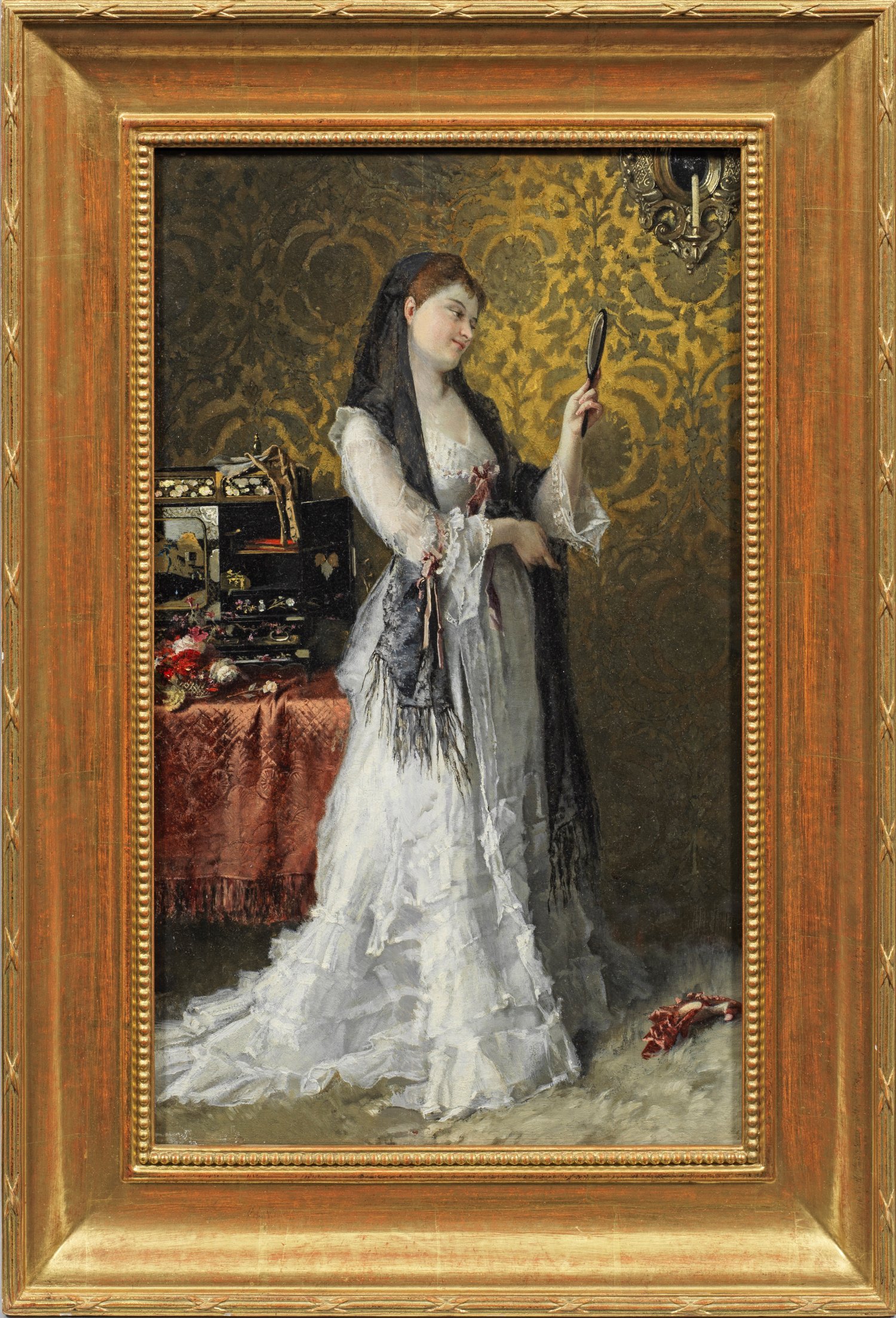 Ganzfigurige Darstellung der sich mit einem Handspiegel betrachtenden Dame in einem langen, teilw. halbtransparenten Chiffonkleid. Elegantes, frühes Werk Kiesels, bei dem es ihm darum ging, deren Schönheitsreize und Anmut zum Ausdruck zu bringen. Kiesel studierte an der Düsseldorfer Akademie, 1885 ließ er sich in Berlin nieder, wo er schon seit 1870 die Ausstellungen der dortigen Kunstakademie beschickt hatte. Als einer der bedeutendsten deutschen Repräsentanten der Salonmalerei seiner Zeit stellte er mit Vorliebe Mädchen und Damen der Gesellschaft dar, womit er zugleich seine Begabung für Stofflichkeit zeigen konnte. Auch international war Kiesel u. a. in Wien und London sowie auf den Weltausstellungen in Paris 1900 und Rom 1911 erfolgreich vertreten. Öl/Mahagonitafel. Am rechten Bildrand sign. mit Ortsangabe Düsseldorf.; 44 cm x 26,5 cm. Rahmen.