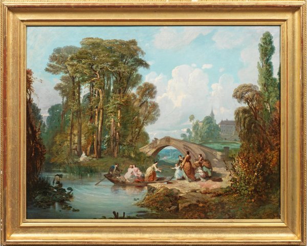 Szene vor einer steinernern Bogenbrücke, im Hintergrund ein Schloss. Großformatiges, von Watteau und der französischen Barock-Malerei inspiriertes Werk des vielseitigen Landschafts-, Historien- und Genremalers. Massenot studierte an der École des Baux-Arts in Paris bei Michel Martin Drolling, 1855-1864 stellte der Künstler, nun selbst Professor an der École des Beaux-Arts in Dijon, seine Werke regelmäßig im Pariser Salon aus. Öl/Lwd.; R. u. sign. u. dat. 1865. Rest.; 91 cm x 121 cm. Rahmen.