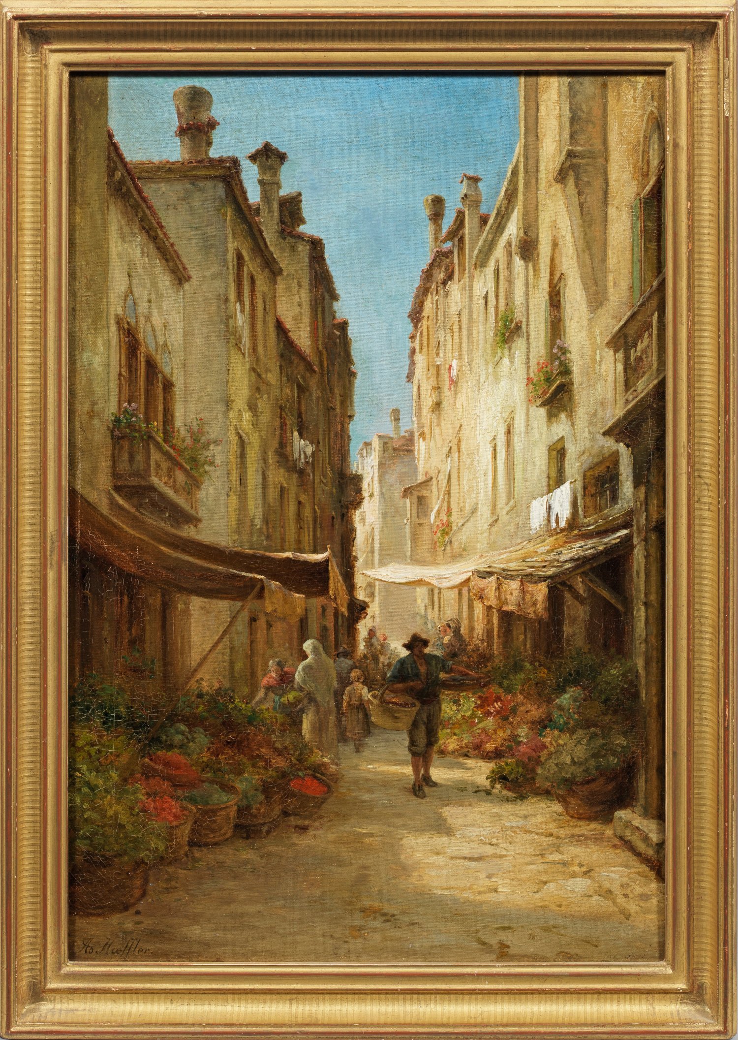 Atmosphärisch gestimmte Italien-Ansicht des Künstlers mit effektvoller Wiedergabe des mediterranen Lichts. Höffler, Sohn des Malers Heinrich Friedrich Höffler, studierte 1847/48 Malerei am Städelschen Kunstinstitut sowie an den Akademien in München und Düsseldorf, u. a. bei Karl Ferdinand Sohn. 1848-1853 verbrachte Höffler in den USA und auf Kuba, die von den Studienreisen mitgebrachten Skizzen dienten ihm später auch als Vorlagen für Ölgemälde. Zurückgekehrt nach Frankfurt unterrichtete er selbst am Städelschen Kunstinstitut, seine amerikanischen Landschaften bzw. Ansichten erschienen auch als illustrierte Reiseberichte in "Harper’s Magazine", außerdem schilderte er Landschaftsmotive aus Italien und der Umgebung Frankfurts. Öl/Lwd.; L. u. sign., 56,5 cm x 39 cm. Rahmen.