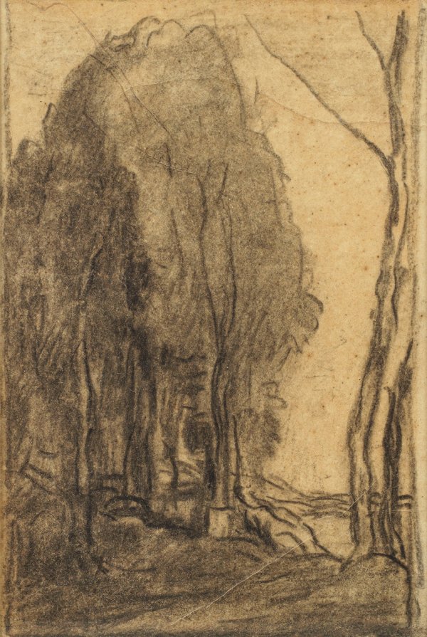 Mit wenigen Strichen und flächigen, nuancierten Lavierungen schilderte Corot eine Landschaft mit hoch aufragenden Bäumen, die er nach rechts künstlerisch geschickt mit einem niedrigen Horizont zum Himmel öffnete und hierdurch zugleich die effektvollen Hell-Dunkel-Kontraste herausarbeiten konnte. Motiv und Stil der für Corot charakteristischen Landschaft lassen darauf schließen, dass die Zeichnung aus dessen reifer Schaffensperiode ab 1850 stammt, als er zu freien, aber straffen Kompositionen mit auf die Gesamtstimmung angelegten Darstellungen fand. Corot war einer der Hauptvertreter der Schule von Barbizon und prägte als Maler, Zeichner und Grafiker in entscheidender Weise die Entwicklung der Kunst zum Impressionismus. Kohle/Papier. Minim. stockfleckig, Läsuren. 23 cm x 15,5 cm. Rahmen.