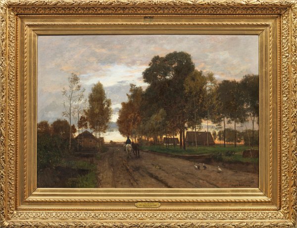 Blick auf eine holländische Dorfstraße mit Entenschar und einem Bauern zu Pferde im Abendlicht. Stimmungsvolles, von der Schule von Barbizon beeinflusstes Hauptwerk Jettels, das er 1875 auf dem Salon in Paris ausstellte (Kat.-Nr. 1124). Jettel studierte 1860-1869 Landschaftsmalerei an der Wiener Akademie bei Albert Zimmermann. Studienreisen führten ihn nach Holland, Italien, Istrien und Ungarn, abschließend nach Frankreich, wo er von der Malerei von Jules Dupré und Théodore Rousseau geprägt wurde. 1873 oder 1875 ging Jettel nach Paris, wo er auch in der französischen Hauptstadt reüssierte und regelmäßig auf den unterschiedlichen Salons vertreten war. Jettel fand Anschluss an die Schule von Barbizon und französische Künstlerkollegen, 1897 wurde er als besondere Ehrung Ritter der Ehrenlegion. Außer Goldmedaillen in Paris (1889) erhielt er weitere bei den Kunstausstellungen bzw. Weltausstellungen in Antwerpen und Chicago (1893). 1897 kehrte Jettel nach Wien zurück, wo er Gründungsmitglied der Wiener Secession wurde und 1899 auf deren IV. Ausstellung vertreten war. Öl/Lwd., doubl.; R. u. sign. "Eugène Jettel pinx."; 83 cm x 120 cm. Original-Rahmen.