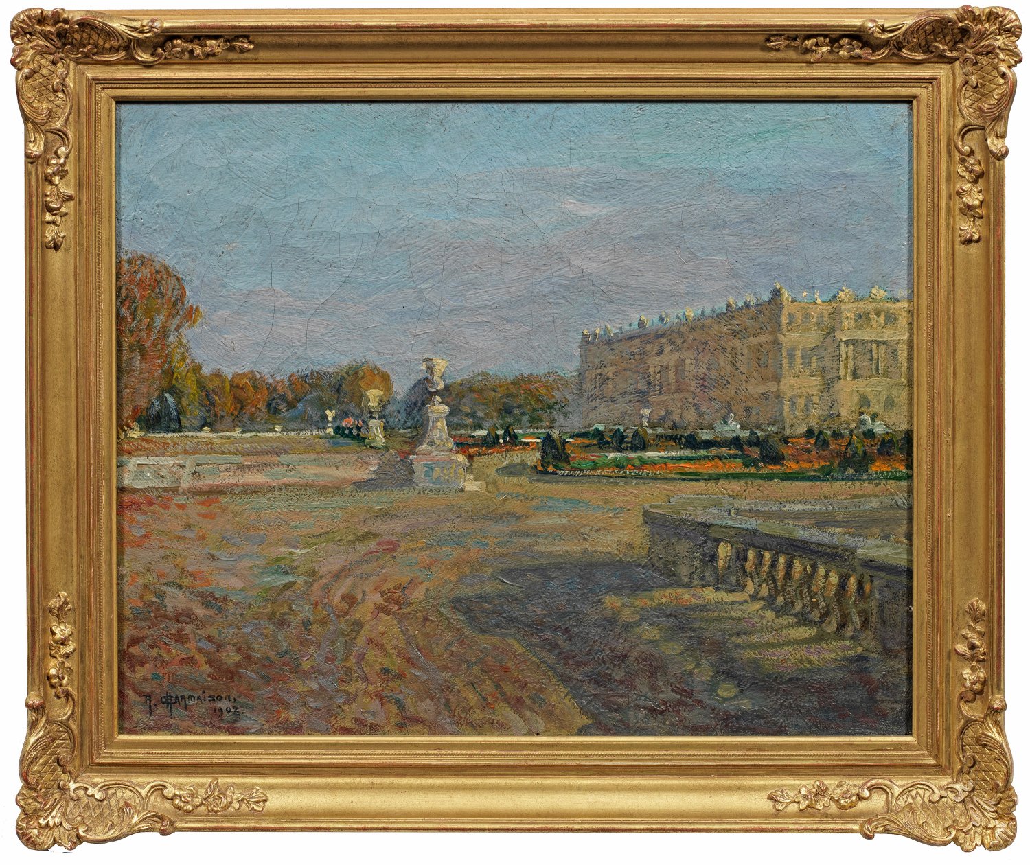 Herbstlich gefärbte, stimmungsvoll angelegte Impression des französischen Malers, der von 1903 - 1906 im Salon d'Automne in Paris ausstellte. Charmaison war Mitglied der Société Nationale des Beaux-Arts und der Société des Artistes Décorateurs. Er schuf Landschaften und Ansichten von Paris, betätigte sich aber auch als Innendekorationsmaler und Illustrator, u.a. für "Les Jardins précieux" von Henri de Régniers, das 1919 erschien. Öl/Lwd.; L. u. sign. und dat. 1903. Verso mit Stempel des Atelierverkaufs. 33 cm x 41 cm. Rahmen.