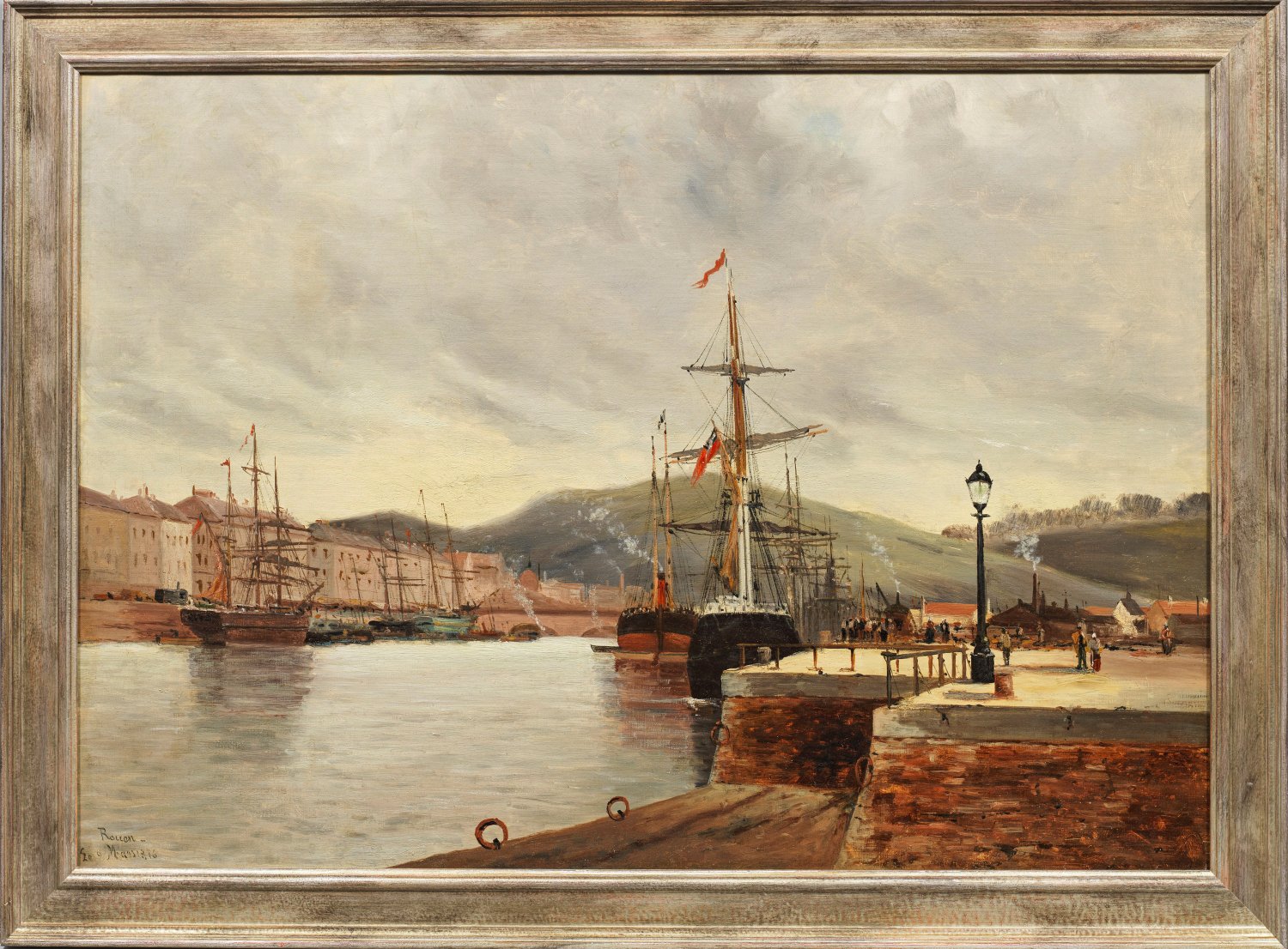 Unter atmosphärisch gestimmtem Himmel gemalter Hafenblick mit Schiffen, Architektur und Personenstaffage auf der Promenade. Im erdigen Kolorit und subtiler, realistischer Schilderung charakteristische Vedute Nicolles, der neben Stillleben seine Motive überwiegend in seiner Heimatstadt und deren Umgebung fand. Seine gestochenen Landschaften und Ansichten sind zahlreich in den bedeutenden, französischen Grafiksammlungen wie u.a. des Musée du Louvre vertreten. Als Großvater der Künstler Marcel Duchamp, Jacques Villon, Raymond Duchamp-Villon und Suzanne Duchamp erteilte er diesen ihre ersten Unterrichtsstunden. Öl/Lwd., doubliert. L. u. ortsbezeichnet und dat. "Rouen Le 9. Mars 1876". 64 cm x 91 cm. Rahmen.