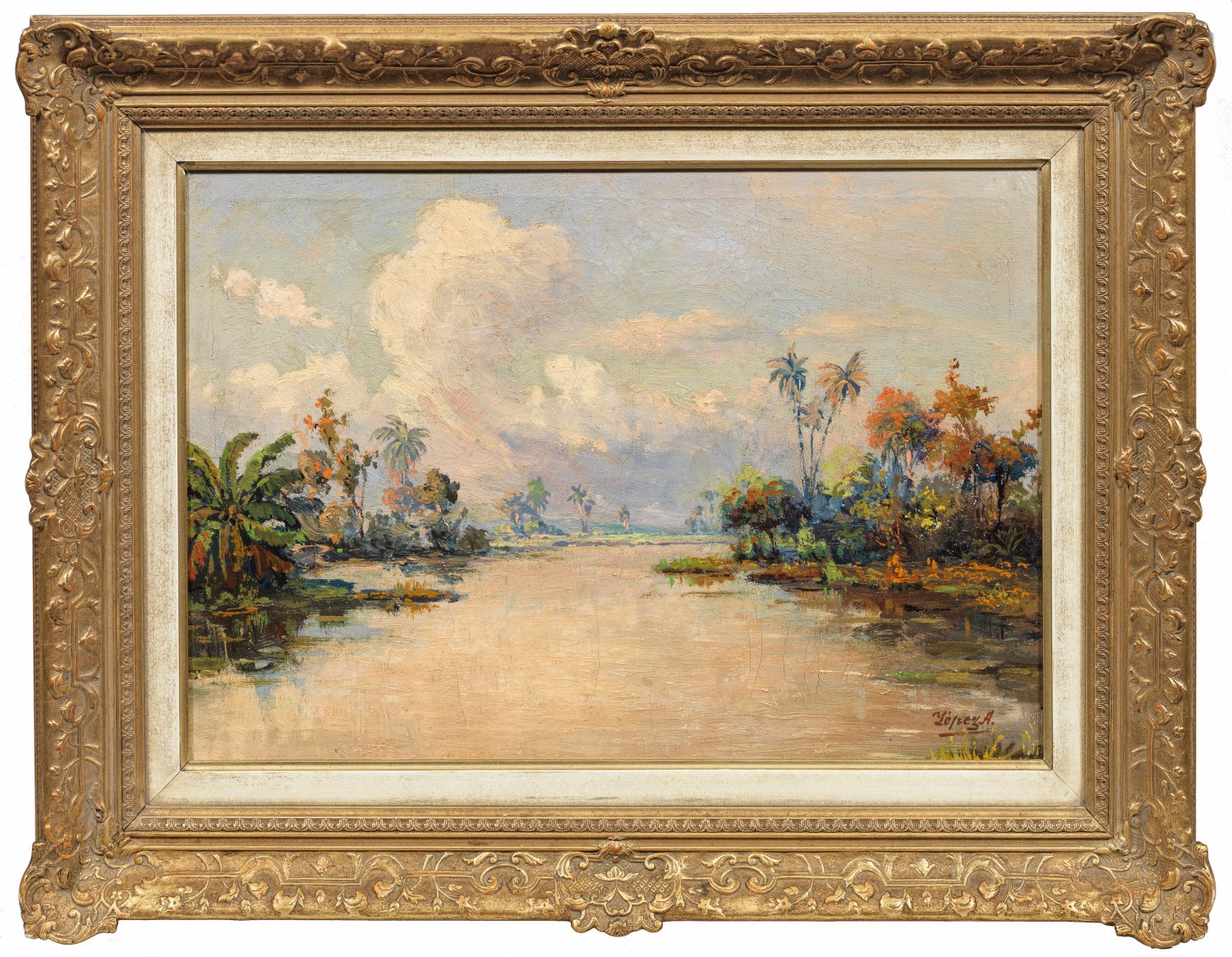 Motiv aus dem sog. "Oriente" im Osten des Landes mit den Regenwäldern des Amazonasbeckens. Impressionistisches Werk des südamerikanischen Malers, der an der Academia de Bellas Artes in Quito studierte und dort in den 1930er auch als Professor lehrte. Das Oeuvre von Yepez Arteaga, der mit vielen Bildern in öffentlichen Gebäuden Quitos vertreten ist, umfasst außer Landschaften auch Einzel- und Gruppenbildnisse der ländlichen Bevölkerung sowie Darstellungen aus der Geschichte der Stadt und der Ecuadors. Öl/Lwd.; R. u. sign.; 37,5 cm x 54 cm. Rahmen.