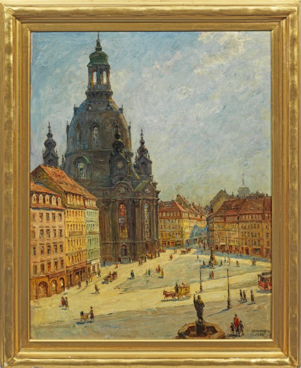 Impressionistische, in effektvoller Lichtbehandlung und lockerem Duktus gemalte Ansicht des Dresdner Neumarktes mit dem monumentalen Kuppelbau der Frauenkirche, belebt durch einige Fußgänger, Kutschen und eine Straßenbahn. Der Schlesische Maler Rothkirch lernte bei Richard Müller in Dresden und war später lange Zeit in Brasilien tätig, weshalb er auch "Brasil Oskar" genannt wurde. Öl/Lwd.; R. u. sign. und dat. 1922. 92 cm x 74 cm. Rahmen.