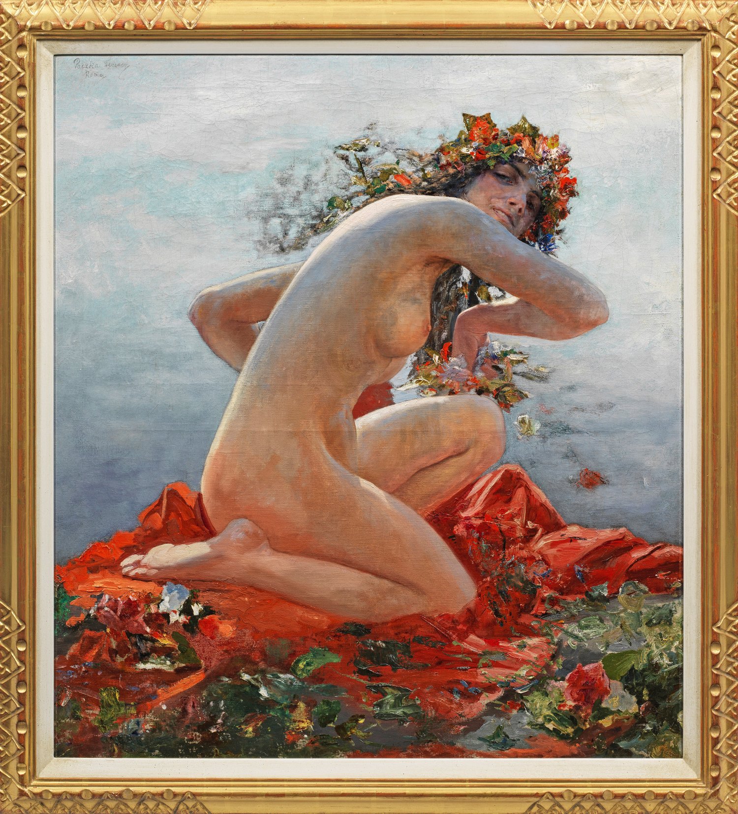 Auf einem leuchtend roten Tuch von bunten Blüten und Blättern übersät der hockende weibliche Akt mit einem prachtvollen Blumenkranz in den Haaren. In lockerem Duktus und leuchtenden Farben gemaltes, subtil beobachtetes Werk des ungarischen Malers Paczka, der seine Studien an der Münchner Akademie bei Strahuber, Seitz und Diez begann und später in Rom und in Paris bei Zichy fortsetzte. Anschließend ließ er sich in Berlin nieder. Neben religiösen Gemälden und Historienbildern, die die Einflüsse sowohl des Jugendstils als auch des Symbolismus erkennen lassen, malte Paczka auch zahlreiche Landschaften und Porträts. Öl/Lwd.; L. ob. sign. und mit Ortsangabe Rom. 89 cm x 80 cm. Rahmen.