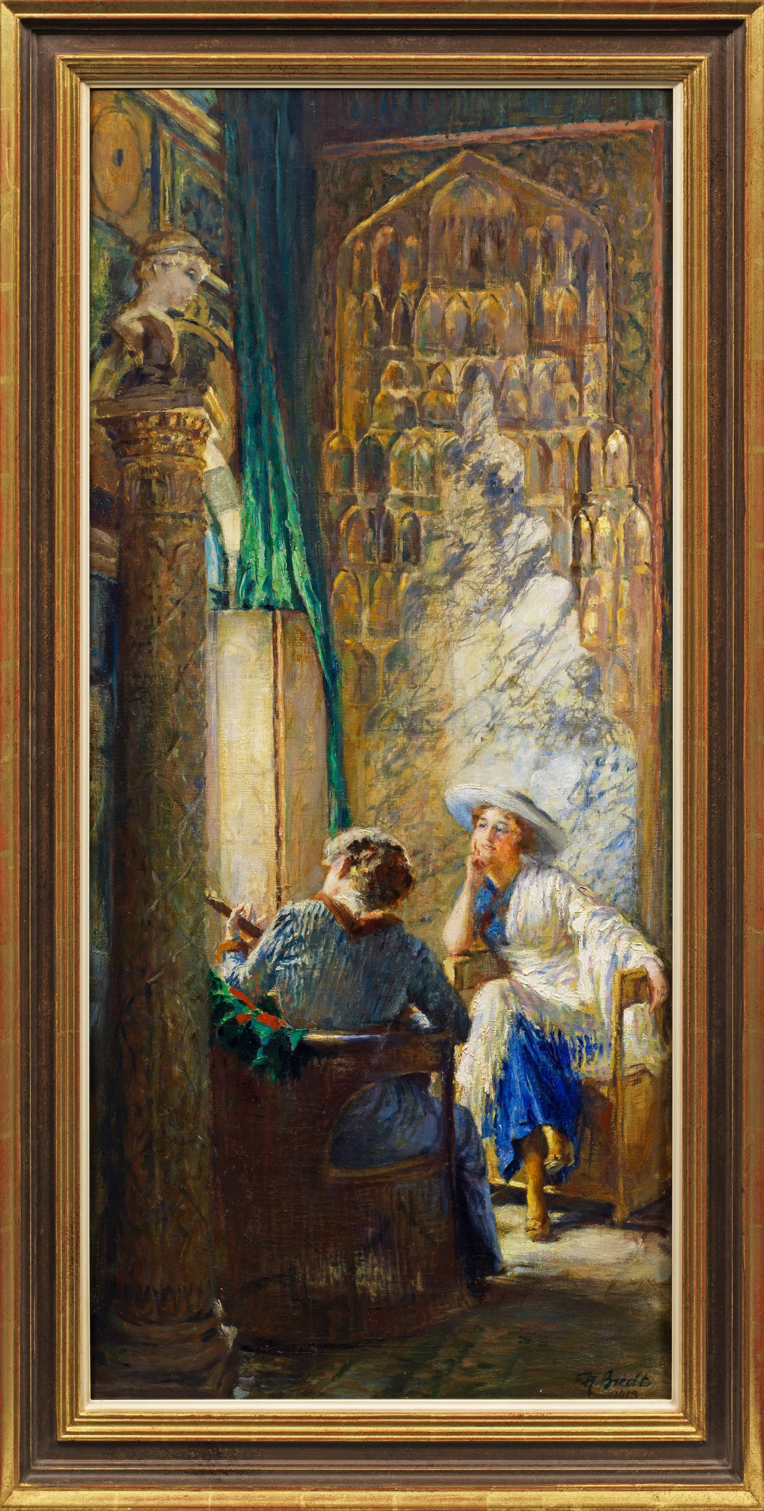 Impressionistisches Interieurbild aus dem reifen Oeuvre Bredts, der hierin das effektvolle Farbenspiel des Lichts einfängt. Der heute vor allem als Orientmaler bekannte Künstler studierte seit 1877 in Stuttgart an der Kgl. Kunstschule bei Bernhard von Neher und Carl von Häberlin, 1880 wechselte er an die Münchner Akademie zu Wilhelm von Lindenschmit d. J.; Seine Orientreisen seit den 1880er Jahren führten ihn u. a. in die Türkei und nach Tunesien. 1883 debütierte er mit dem Gemälde "Türkische Frauen" bei der Münchner internationalen Kunstausstellung, zahlreiche Ausstellungen in der bayerischen Hauptstadt, in Berlin und Wien sowie die Pariser Weltausstellung (1900) folgten. 1892 war Bredt Mitbegründer der Münchener Secession. Öl/Lwd.; R. u. sign. u. dat. 1915. Verso vom Künstler bez. u. betitelt. 108 cm x 49,5 cm. Rahmen.