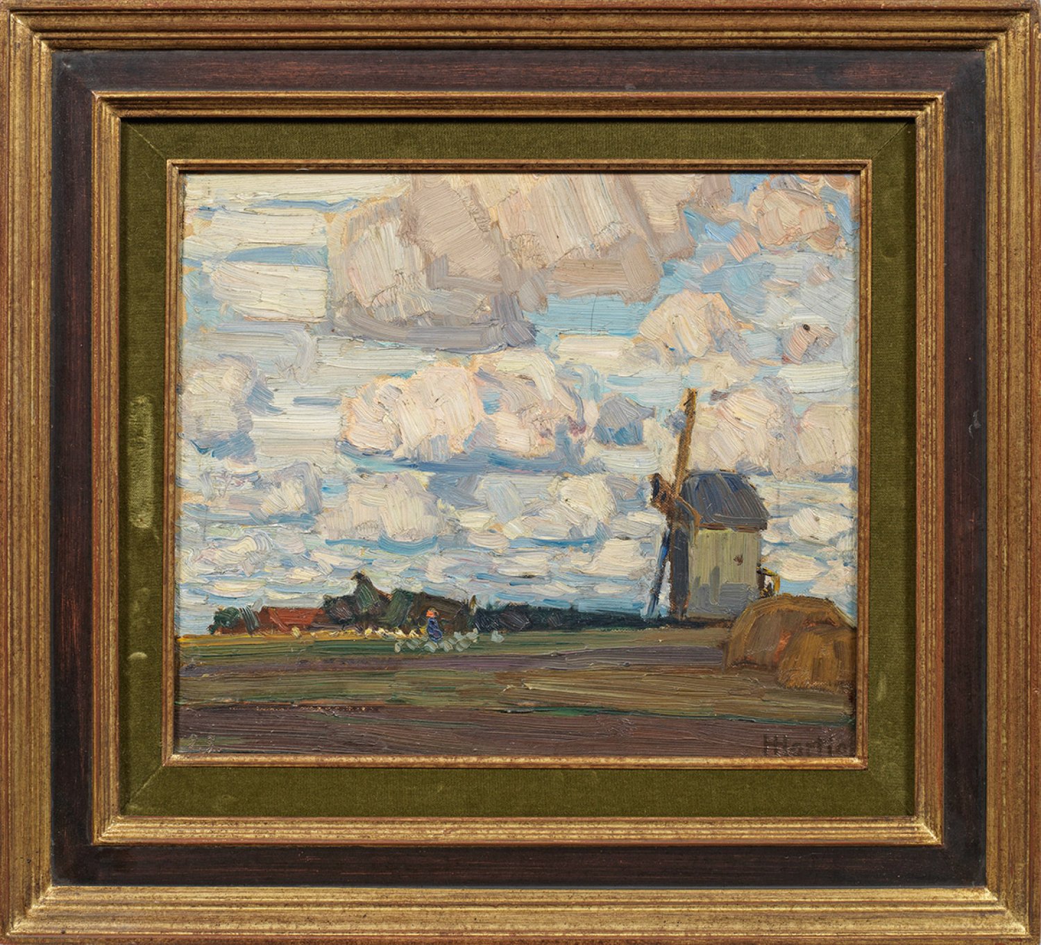 Impressionistische, pastose Landschaftsdarstellung mit Schafsherde vor Dorfkulisse und Windmühle. Hartig, Meisterschüler von Eugen Bracht, debütierte 1901 mit sensationellem Erfolg auf der Großen Berliner Kunstausstellung, 1906 auch in der Berliner Secession. Öl/Malkarton; R. u. sign.; L. u. dat. (19)22 (oder 29); Verso Nachlass-Stempel u. Etikett mit Echtheitsbestätigung des Neffen Siegfried Hartig. 30,5 cm x 35 cm. Rahmen.