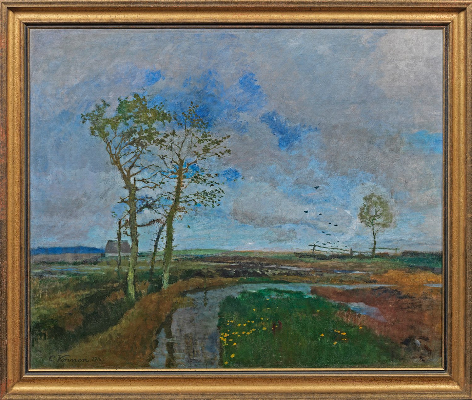 Blick auf eine Moorlandschaft mit drei einzelnen Birken und einer einsamen Moorkate. Durch den niedrigen Horizont werden der hohe, norddeutsche, lebendig bewölkte Himmel und die Spiegelungen auf dem Wasser zu Hauptstimmungsträgern. Mit weich-pastosem Duktus gemalte, impressionistische Landschaft Vinnens, der zum engsten Umfeld der Worpsweder Künstler gehört. Vinnen studierte an den Kunstakademien Düsseldorf und Karlsruhe bei Heinrich Lauenstein und Hugo Crola, zudem nahm er Privatunterricht bei Eugen Dücker. In Düsseldorf lernte er Fritz Mackensen und Otto Modersohn kennen, die ihn 1889 einige Wochen auf dem von Vinnen bewohnten väterlichen Gut in Osterndorf (heute ein Ortsteil von Beverstedt) besuchten. Im selben Jahr gründeten Mackensen, Modersohn und Hans am Ende im circa 25 Kilometer von Osterndorf entfernten Worpswede ihre Künstlerkolonie Worpswede. Vinnen schloss bei späteren gegenseitigen Besuchen in Worpswede und Osterndorf auch Bekanntschaft mit Hans am Ende, Fritz Overbeck (1892), Heinrich Vogeler (1894) und Paula Modersohn-Becker. Ohne ein "Worpsweder" im eigentlichen Sinne zu sein und obwohl er auch nie dort seinen Wohnsitz hatte, zeigt seine Kunst sichtlich seine Verwandtschaft zu Modersohn, am Ende und Overbeck. Zudem wurde Vinnen auch von außen als Mitglied der Worpsweder Künstlerkolonie wahrgenommen. Vinnen und seine Worpsweder Kollegen gründeten 1894 die Künstlervereinigung Worpswede, die 1895 ihren Durchbruch im Münchner Glaspalast erlebte, er selbst wurde von einem Kritiker "Führer der jungen Künstlerschar aus Worpswede" bezeichnet. 1903 erhielt Vinnen auf der Großen Berliner Kunstausstellung eine Goldmedaille. Öl/Lwd.; L. u. sign. u. dat. 1916. 97,5 cm x 120 cm. Rahmen.