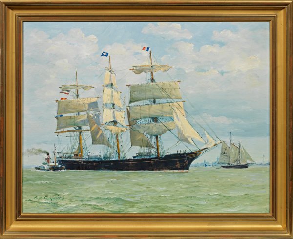 Begleitet von einem kleinen Schaufelraddampfer und einem Ewer gleitet der Großsegler unter teilweise gerefften Segeln auf ruhiger See dahin, im Hintergrund erhebt sich schemenhaft eine Hafenkulisse. In hellem Kolorit und feinmalerischem, pastosem Pinselstrich schafft Chapelet ein subtil beobachtetes Schiffsportrait mit atmosphärischer Lichtbehandlung - charakteristisch für sein Oeuvre. Der französische Marinemaler arbeitete zunächst für das Marineministerium und begann 1927 zu malen. Während des Zweiten Weltkriegs nahm er an zahlreichen Operationen der französischen Marine teil und hielt diese bildlich fest. Öl/Lwd.; L. u. sign. und mit Schiffsname bez.; 65,5 cm x 50 cm. Rahmen.