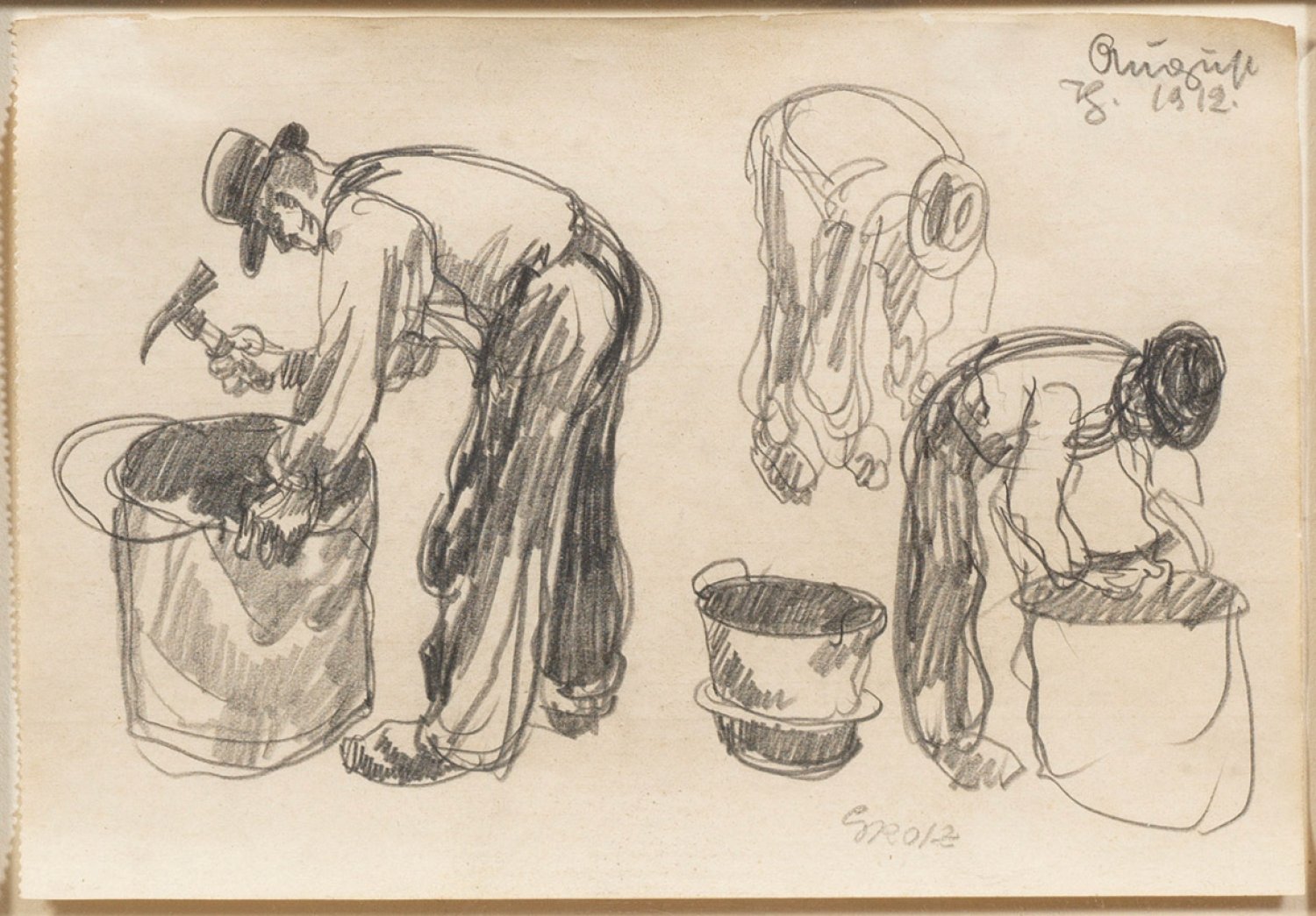 Frühes Blatt des Künstlers, dem es in dieser Zeichnung insbesondere um die charakteristische Haltung der Figuren bei ihrer schweren Arbeit ging. Grosz studierte mit einem Staatsstipendium ab 1912 an der fortschrittlichen Berliner Kunstgewerbeschule bei Emil Orlik. Als gesellschafts- und sozialkritischer Realist schilderte er das gesamte öffentliche und private Alltags- und Nachtleben. Hierzu gehörte ab 1912/13 auch das Leben und Schicksal der Arbeiter, das ihm in Berlin in teilw. drastischer Unmittelbarkeit vor Augen stand. Bleistift/Papier. R. u. sign.; R. o dat. August 1912. 12,2 cm x 17,7 cm. Rahmen.