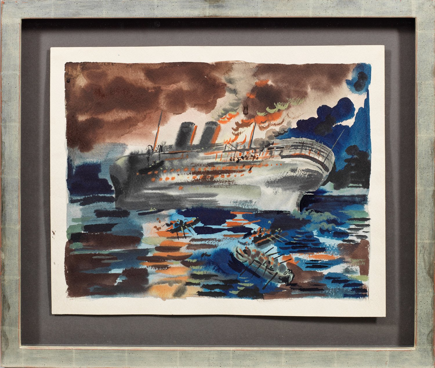 In Duktus, Kolorit und Lichtbehandlung äußerst dramatisch komponiertes Blatt, das den Brand des Luxusdampfers "Morro Castle" vom 8. September 1934 auf dem Weg zurück von Havanna nach New York zeigt. Das Schiff, bereits in leichter Schräglage, steht in Flammen, während im Vordergrund drei voll besetzte Rettungsschiffe versuchen, sich in Sicherheit zu bringen. Die aufwühlenden Ereignisse dieses Unglücks hält Grosz in einigen wenigen Arbeiten aus den Jahren 1934 und 1935 fest, von denen eines bereits 1941 auf der großen Retrospektive des Museum of Modern Art in New York gezeigt wurde. Grosz studierte mit einem Staatsstipendium ab 1912 an der fortschrittlichen Berliner Kunstgewerbeschule bei Emil Orlik. Als gesellschafts- und sozialkritischer Realist schilderte er das gesamte öffentliche und private Alltags- und Nachtleben. Noch vor der sog. "Machtergreifung" Ende Januar 1933 emigrierte Grosz in die USA. Dort gelangte er schnell zu hohem Ansehen, während seine Arbeiten in Deutschland zeitgleich als "entartet" verfemt wurden und somit billigst ins Ausland verkauft oder gar vernichtet wurden. Aquarell/Bütten. Verso betitelt u. dat. 1934 sowie auf dem Nachlassstempel nummeriert 1-113-3. Blatt 39,4 cm x 49,5 cm. Rahmen.