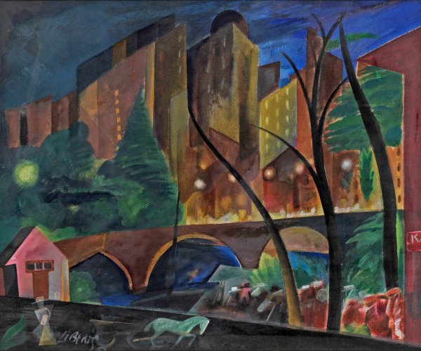 Unter dunkel gefärbtem Nachthimmel, beleuchtet durch zahlreiche Straßenlaternen erstrahlt eine städtische Kulisse in kräftigen Farben, belebt durch eine Menschenmenge und eine Person mit kleinem Pferdewagen im Vordergrund. Wohl Anfang der 1920er Jahre gemalte, kubistische Komposition Liberts, dessen Frühwerk ganz unter dem Einfluss der modernen französischen Malerei und des russischen Kubofuturismus stand. Der Lettische Maler, der auch als Bühnenbildner international große Erfolge feierte, studierte an der Moskauer Stroganow-Schule und an der Kunstschule in Kasan. Gouache/Karton. L. u. sign.; Kleiner Einriss. 65,5 cm x 78,5 cm. Rahmen.