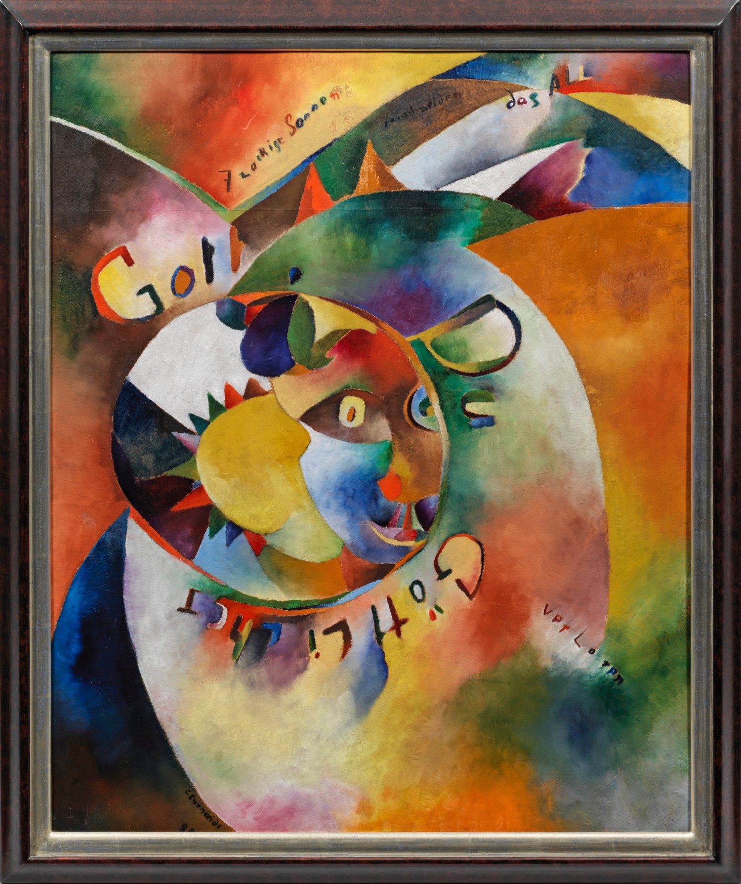 Aus großen, in sich farbig changierenden Flächen gebildete Komposition, die von einer runden Fläche mit stilisiertem Kopf und einer Sonne bestimmt wird, umrahmt vom Schriftzug "Gott Du Göttlicher", verteilt weitere Inschriften "7lockigen Sonnen", "das ALL" und "VerLoren". 1920 entstandenes, frühes Hauptwerk Ehrhardts, der 1916 erste Anregungen durch die von Herwarth Walden veranstaltete "Sturm"-Wanderausstellung in Berlin mit Werken Picassos, Chagalls, Campendoncks, Marcs und Schwitters' erhielt. 1918 schloss er sich der "November"-Gruppe an; neben der "Sturm"-Avantgarde inspirierte ihn der Kubismus, Futurismus, die Kunst des "Blauen Reiter" und der Orphismus Robert Delaunays. 1919-1922 beteiligte sich Ehrhardt an renommierten großen Ausstellungen - der Dresdner Sezession (1919), der Großen Kunstausstellung in Berlin (1920, mit neun Werken), der Münchner Expressionisten-Ausstellung in Chicago (1921) und der Internationalen Kunstausstellung in Düsseldorf (1922). Öl/Karton. L. u. sign. u. dat. 1920. Überdies rücks. sign., betitelt u. dat. Mai 1920, Ortsangabe "Brandenburg a/H". 84,5 cm x 70 cm. Rahmen.