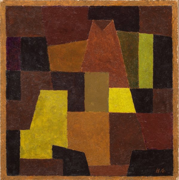 Aus unterschiedlichen Farbflächen gebildete Komposition, in der Grundmann die unterschiedlichen Gewichtungen der Farben im Verhältnis zur Fläche sowie deren Anordnung im Bild auslotete. Entstanden ist es wohl 1928-1931 unter dem prägenden Einfluss der beiden Bauhaus-Meister Johannes Itten und besonders Paul Klee, dessen Schülerin sie in diesen Jahren in Dessau war. Auch Adolf Hölzel gehörte zu den bedeutenden Protagonisten der Abstraktion, den sie 1927 in Stuttgart kennenlernte. Öl/Karton, auf Hinterlegkarton kaschiert. R. u. monogr.; Verso Nachlass-Stempel mit Nr. "ÖK 9". 23,5 cm x 23,5 cm. Rahmen.