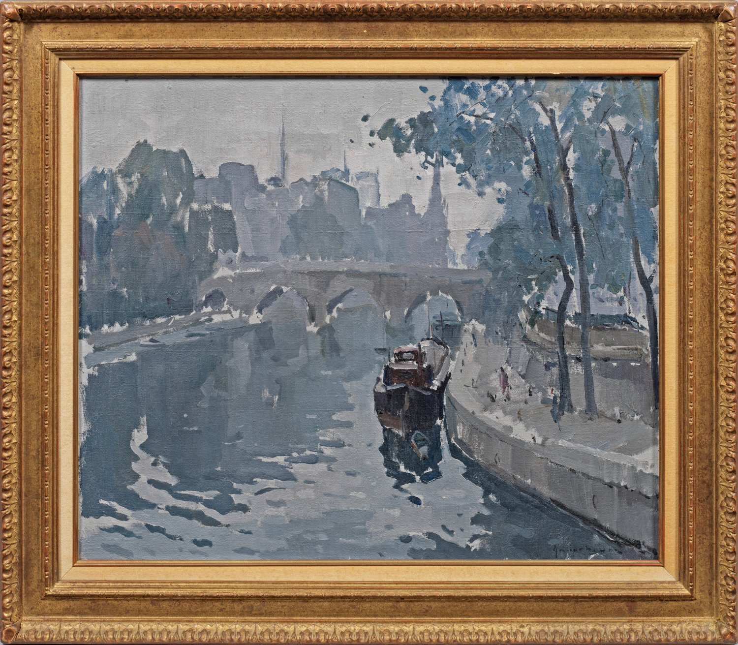 Mit schnellem Duktus in silber- und blaugrauen Tönen gemalte Vedute des Spätimpressionisten, in dessen Oeuvre Paris-Motive ein Hauptsujet sind. Anderbouhr stellte 1937/38 erstmals im Salon d'Automne in Paris aus; 1953-1973 hatte er elf Einzelausstellungen in der renommierten Galerie Durand-Ruel in Paris, danach viele in den USA. Öl/Lwd.; R. u. sign.; 60 cm x 73 cm. Rahmen.