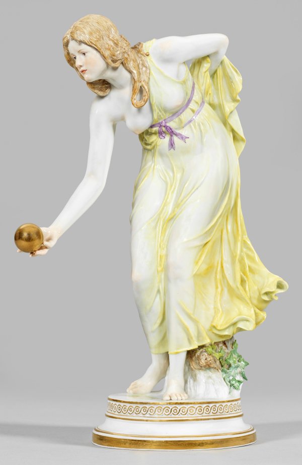 Auf rundem, profiliertem Sockel mit Flechtbandbordüre stehendes, sich vorbeugendes Mädchen in einem hauchdünnen, zitronengelb staffierten Kleid, in ihrer Hand eine goldene Kugel zum Wurf haltend. Polychrome Malerei mit Gold. Entw. Walter Schott, 1897. Modell-Nr. Q 180. Unw. rest.; Schwertermarke. H. 36,5 cm.