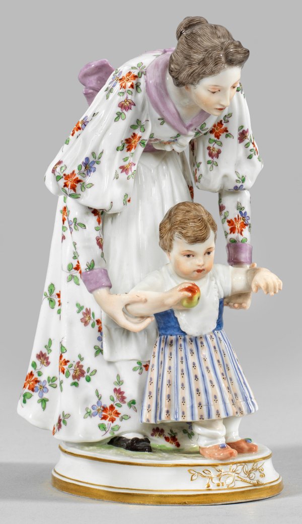 Ovaler, goldkonturierter Sockel. Sich vorneigende junge Mutter in langem mit Blüten gemustertem Kleid, die Gehversuche der kleinen, einen Apfel haltenden Tochter begleitend. Polychrome Malerei. Entw. August Schreitmüller, 1898. Modell-Nr. R 169. Schwertermarke. H. 17,5 cm.