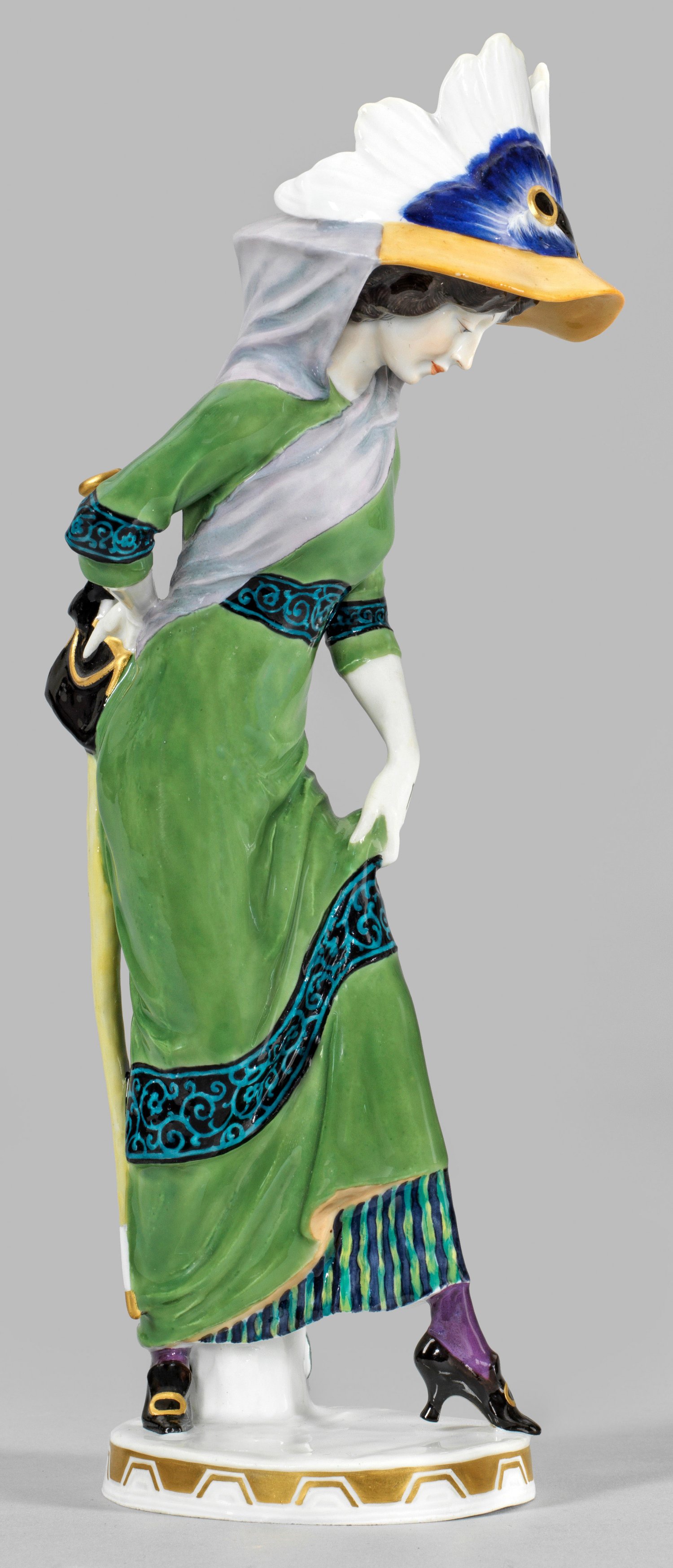 Auf flachem Ovalsockel mit Goldornamentbordüre stehende junge Dame in grünfarbenem Kleid mit schwarz-blauen Spitzenbordüren über gestreiftem Unterkleid, einem pompösen, gelben Hut mit aufwändigem Federschmuck und weißen Handschuhen. Voranschreitend rafft sie mit der linken Hand das Kleid. Die hinter dem Rücken versteckte Rechte hält einen geschlossenen Schirm und eine Handtasche. Äußerst feine polychrome Malerei mit Gold. Entw. Alfred König, 1911. Entw.-Monogr.; Modell-Nr. B 233. Schwertermarke. H. 27 cm.