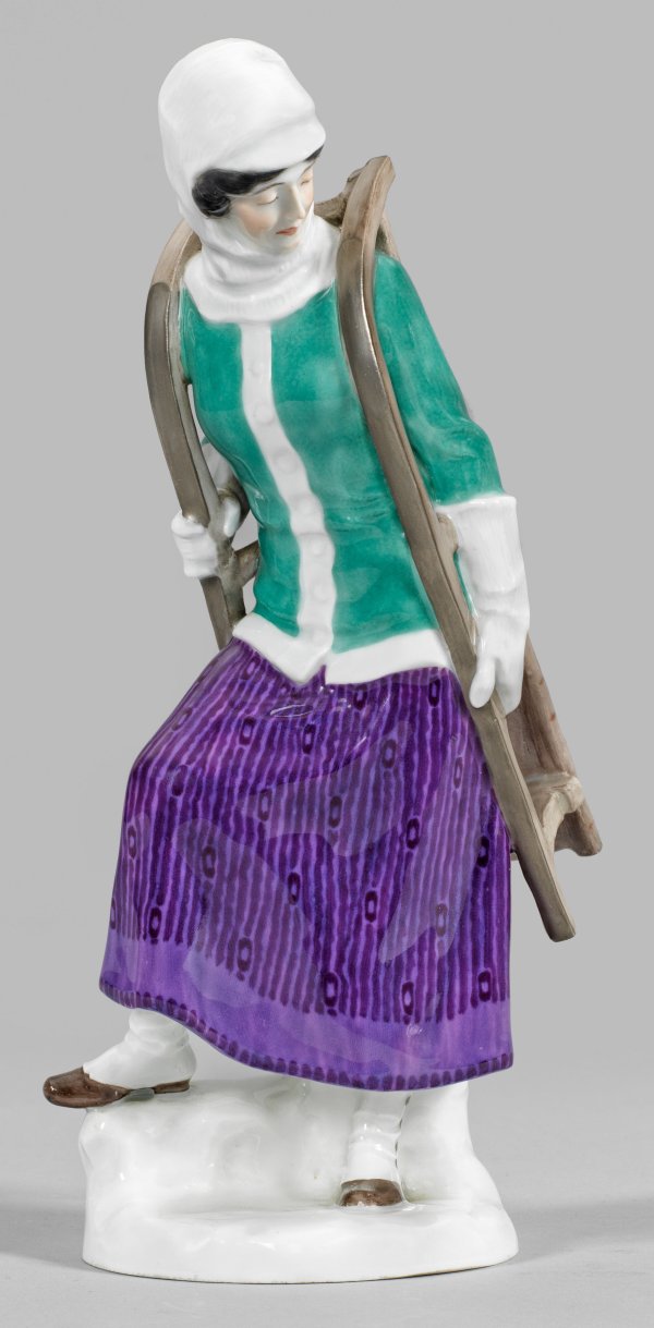 Auf naturalistisch gestaltetem, schneebedecktem Sockel stehende junge Dame in winterlicher Kleidung, den rechten Fuß auf einem Fels lagernd und den Kopf zur Seite wendend. Auf dem Rücken einen Schlitten tragend. Polychrome Unterglasurmalerei. Entw. Alfred König, 1912. Entw.-Monogr. "AK". Modell-Nr. B 235. Schwertermarke. H. 25 cm.
