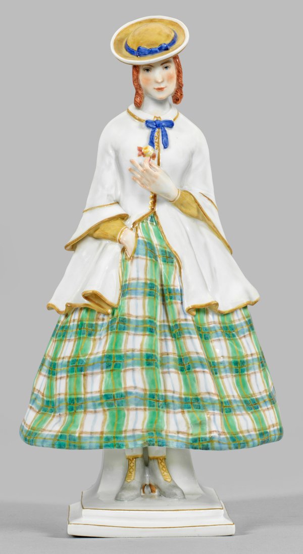 Auf gestuftem Rechtecksockel stehende, zum Boden blickende, junge Dame in kariertem Rock und weißem Mantel über senffarbener, verdeckter Bluse sowie farblich korrespondierendem Tellerhut mit blauer Schleife, sich eine gelbe Rose ansteckend. Polychrome Malerei mit etwas Gold. Entw. Richard Langer, 1914. Modell-Nr. E 233. Schwertermarke. H. 27 cm.