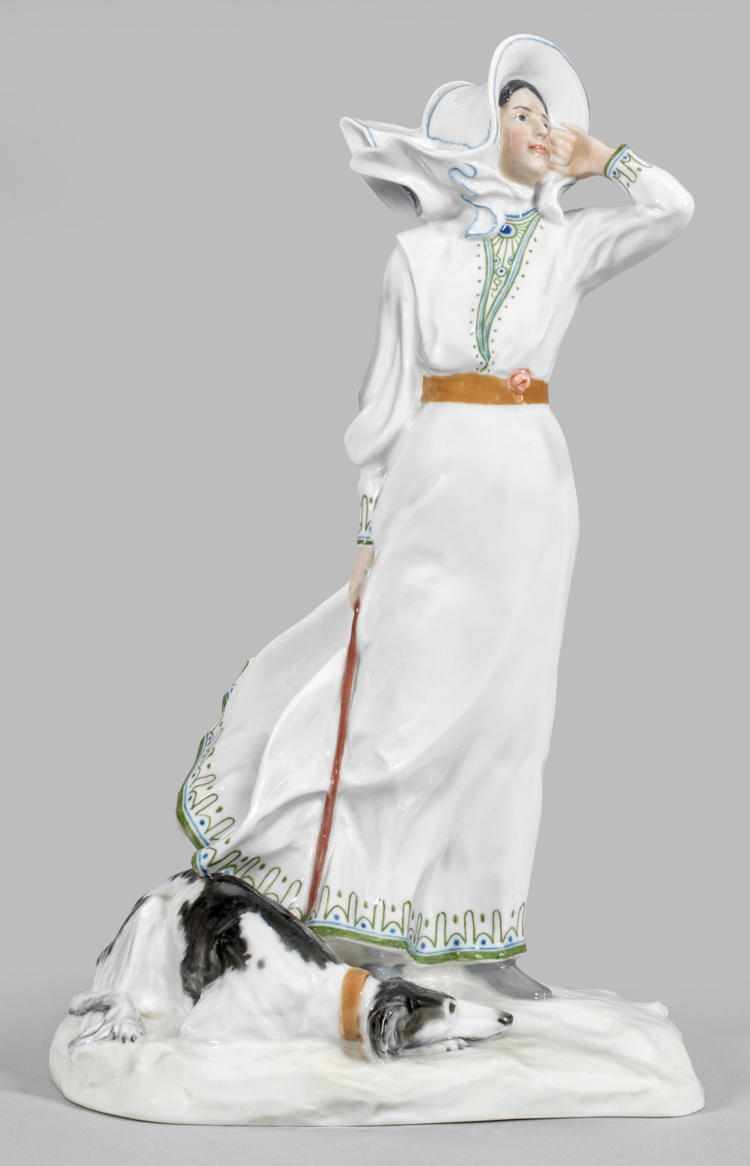 Auf unregelmäßigem Sockel stehende, elegante junge Dame in weißer, grün-blau bordürter und vom Wind bewegter Strandkleidung mit großem Hut, sich auf einen Stock stützend, den Kopf nach links wendend. Zu ihren Füßen liegender, schwarz gefleckter Barsoi. Zartpastelltonig staffiertes, naturalistisches Inkarnat. Polychrome Unterglasurmalerei. Entw. Konrad Hentschel, um 1909 - 1911. Modell-Nr. A 263. Schwertermarke. H. 35 cm.