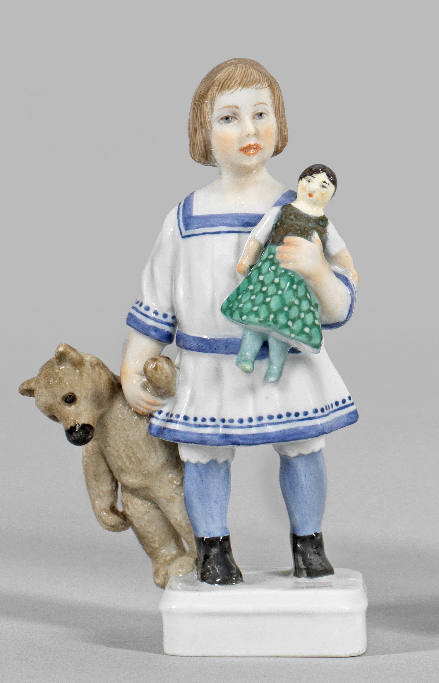 Auf quadratischem Sockel stehendes Mädchen in weißem, blaufarben abgesetztem Kleid, in der rechten Hand einen großen Teddybär, in der Linken eine Puppe haltend. Polychrome Malerei. Entw. Emmerich Oehler, um 1909 - 1911. Unw. rest.; Schwertermarke. H. 13 cm.