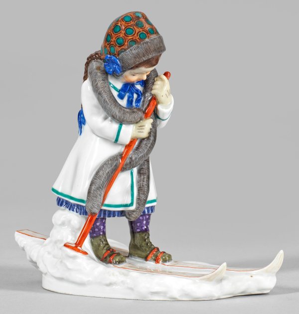 Über schneebedecktem Terrainsockel, auf Skiern stehendes, zu Boden blickendes, kleines Mädchen in pelzverbrämtem, weißem Wintermantel mit gemusterter Mütze, mit beiden Händen einen roten Skistock festhaltend. Polychrome Malerei. Entw. Paul Helmig, um 1912. Modell-Nr. C 242. Minim. rest.; Schwertermarke. H. 15 cm.