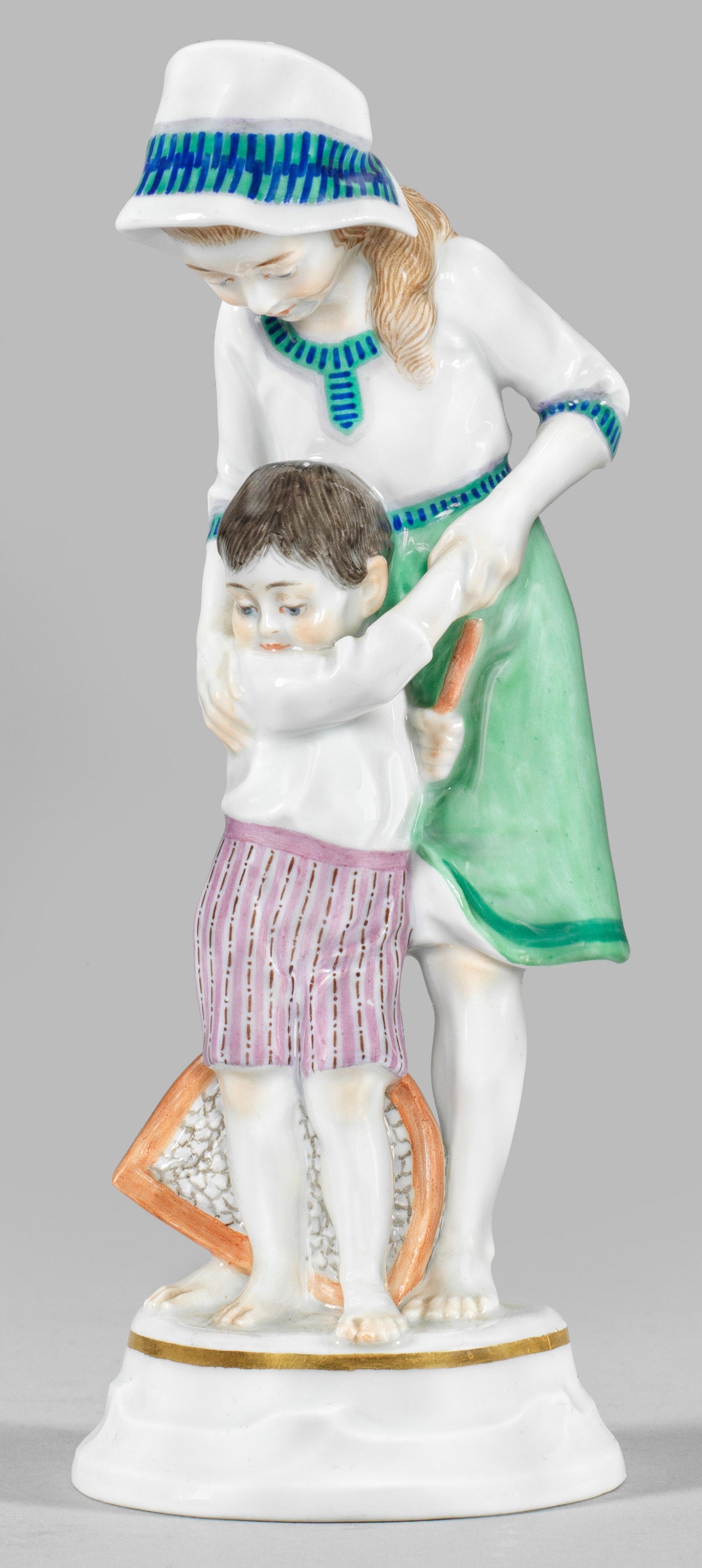 Auf ausgestelltem, goldkonturiertem Rundsockel stehendes Mädchen in sommerlicher Kleidung mit Haube, den vor ihr stehenden, kleinen Bruder festhaltend, der hinter sich versteckt einen Kescher hält und erschrocken zu Boden blickt. Polychrome Malerei. Entw. Alfred König, um 1911. Entw.-Monogr.; Modell-Nr. B 289. Schwertermarke. H. 19 cm.