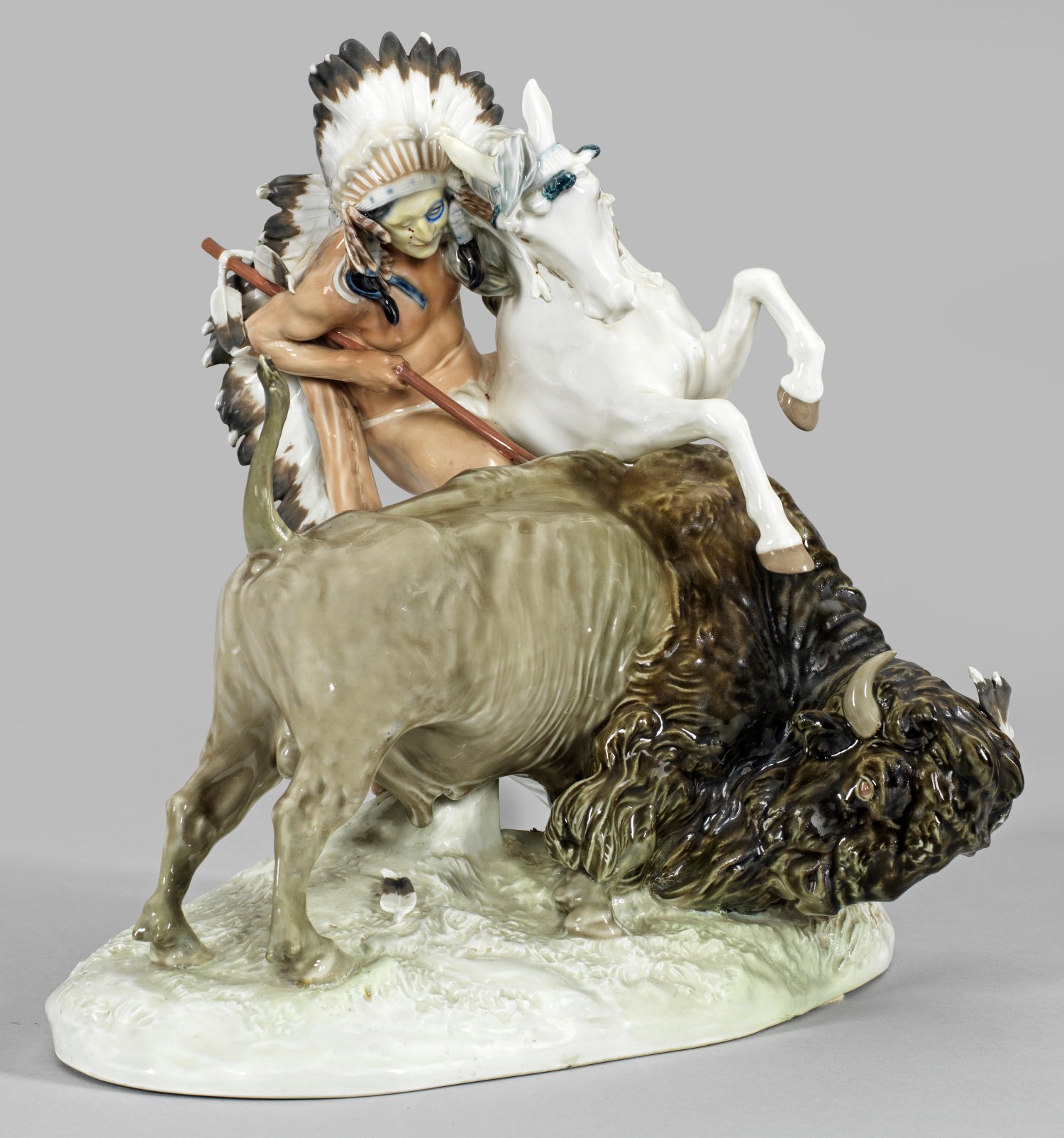 Unregelmäßiger, reliefierter Natursockel. Auf einem sich aufbäumenden weißen Hengst sitzender Indianer mit Lendenschurz und prächtigem Kopfschmuck, mit seinem Speer einen Bison erlegend. Polychrome Malerei. Entw. Erich Hösel, 1906. Modell-Nr. V 120. Unw. rest.; Schwertermarke. H. 33,5 cm. 35 cm x 21 cm.