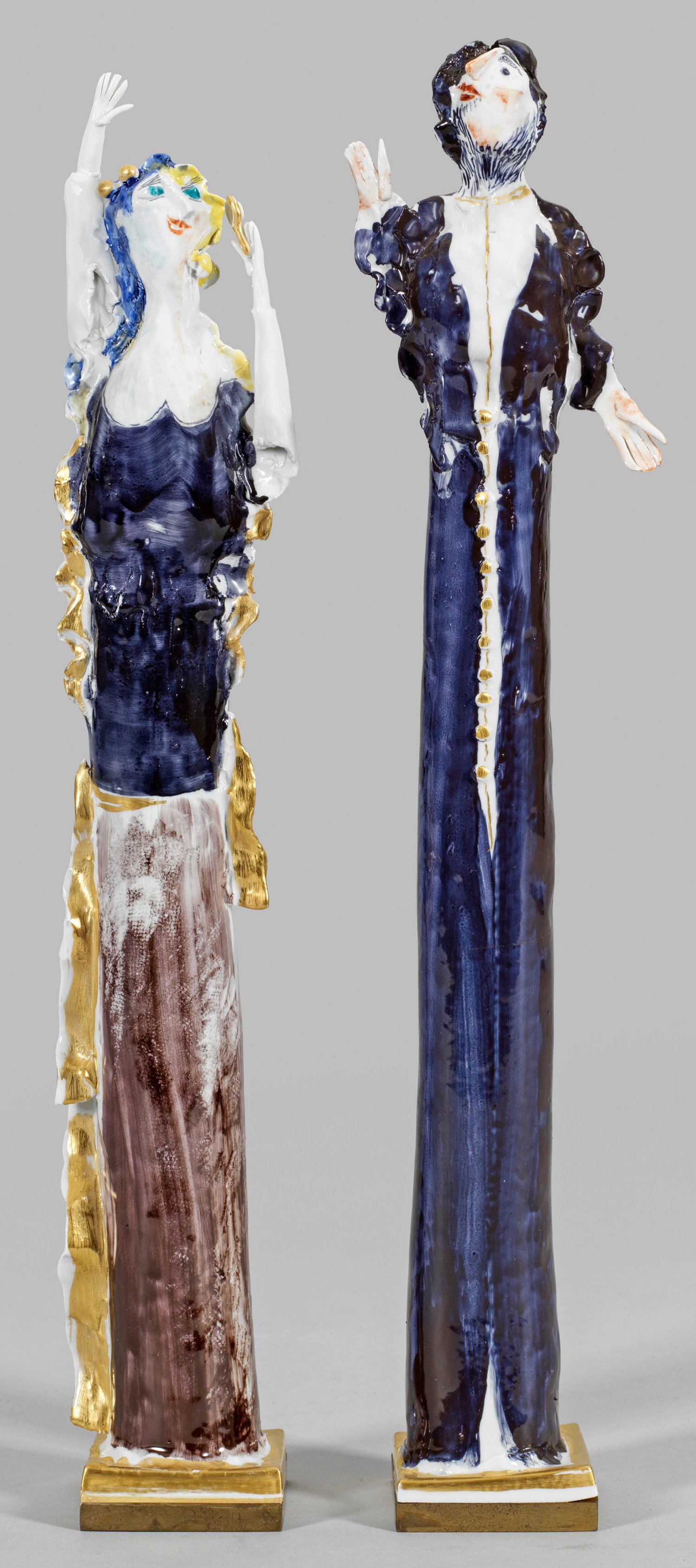 Auf rechteckigem Sockel über Messingplinthe vollplastisch gestaltete, abstrahierende Darstellung einer jungen Frau bzw. eines jungen Mannes. Hermenartig aufgebaute Plastiken aus hohem, rundem Pfeilerschaft mit aufgesetztem Oberkörper, Kopf und Händen, frei modelliert und bossiert. Polychrome Aufglasurmalerei mit radiertem Gold. Form- und Dekor-Entw. sowie Ausführung Peter Strang (1936 - 2022). Reliefiertes, ligiertes Künstler-Monogr. PS (Werkstattzeichen). Geritzte Unikat-Nr. 92/2001 und 99/2001. Unterglasurblaue Schwertermarke. H. 46 cm - 47 cm.