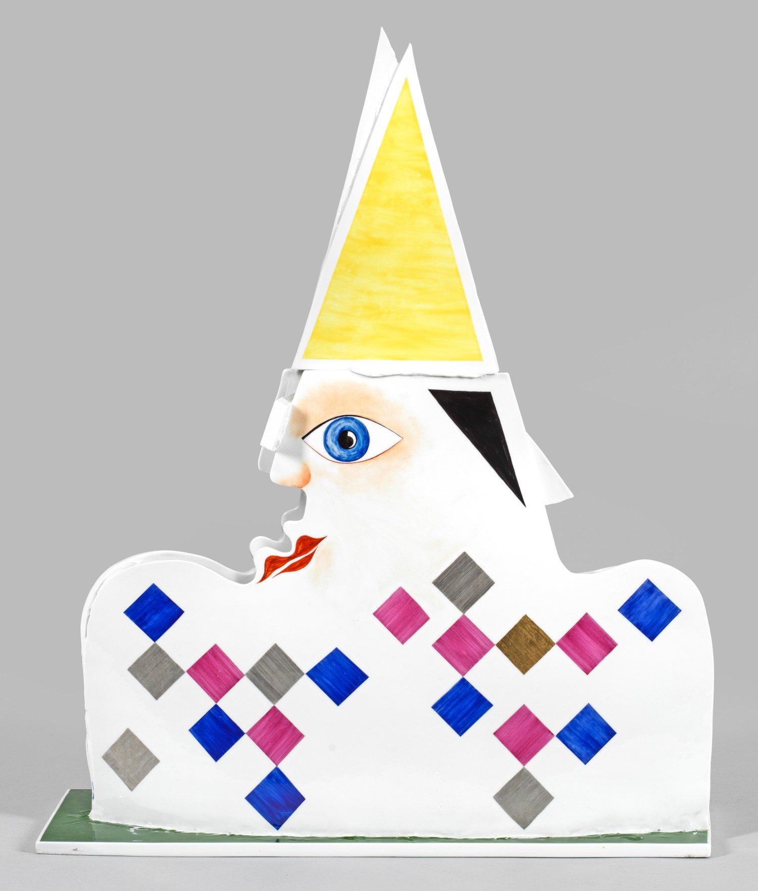 Atelierserie. Auf rechteckiger Plinthe nahezu halbfigurige, stark abstrahiert gestaltete Büste eines Harlekins mit Spitzhut, montiert aus Platten und ausgeschnittenen Formelementen. Kubistisch anmutend mit farbenkräftiger Gestaltung von Gesicht und Harlekinkostüm in polychromer Aufglasurmalerei mit Gold- und Silberakzenten. Form- und Dekor-Entw. sowie Ausführung Olaf Fieber (geb. 1966 in Meißen). Unterglasurblaue Künstler-Sign. "O. Fieber (19) '96" mit Zusatz "A". Geritzte Unikat-Nr. 25/1996. Schwertermarke. H. 54 cm. 44 cm x 13 cm.