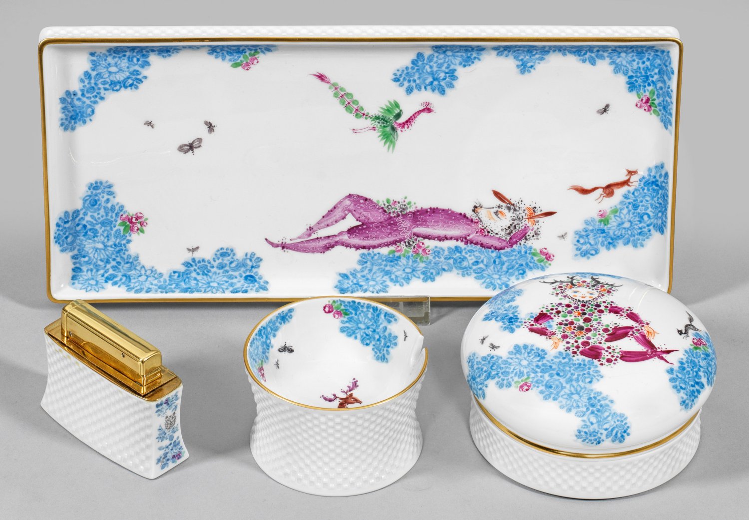 4-tlg.; Aschenbecher, Feuerzeug, Deckeldose und Tablett. Korpuswandungen mit sog. "Kästchenrelief". Auf der Wandung sog. Dekor "Sommernachtstraum", inspiriert von William Shakespeare. Zwischen atmosphärisch anmutenden, blautonigen "Blütenwolken" die Darstellung des Elfenkönigs Oberon mit schwarzem Geweih auf dem Deckel, die liegende Figur "Esel" in Violett auf dem Tablett, umgeben von Eichhörnchen, exotischem Vogel und Insekten sowie verschiedene Tiermotive auf Aschenbecher bzw. Feuerzeug. Feine, polychrome Malerei. Goldrand. Form-Entw. Ludwig Zepner, um 1967. Dekor-Entw. Prof. Heinz Werner, um 1969/70. Schwertermarke. H. 5 cm - 6 cm. Tablett 30,5 cm x 13,5 cm.