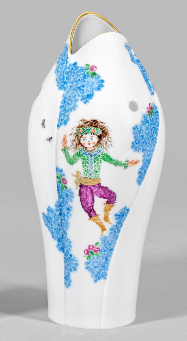 sog. "Fischmaul"-Vase. Schlanker, gebauchter Korpus auf runder Grundfläche mit geschwungenem, fischmundähnlichem Mündungsrand. Auf der Wandung sog. Dekor "Sommernachtstraum", inspiriert von William Shakespeare. Schau- und rückseitig, zwischen atmosphärisch anmutenden, blautonigen "Blütenwolken" schwebende Figur "Tispe" bzw. purpurfarbener Fuchs in feiner, polychromer, teilw. getupfter Malerei. Goldrand. Form-Entw. Zhuoyu Hou, 2016. Dekor-Entw. Prof. Heinz Werner, um 1969/70. Schwertermarke. H. 29 cm.
