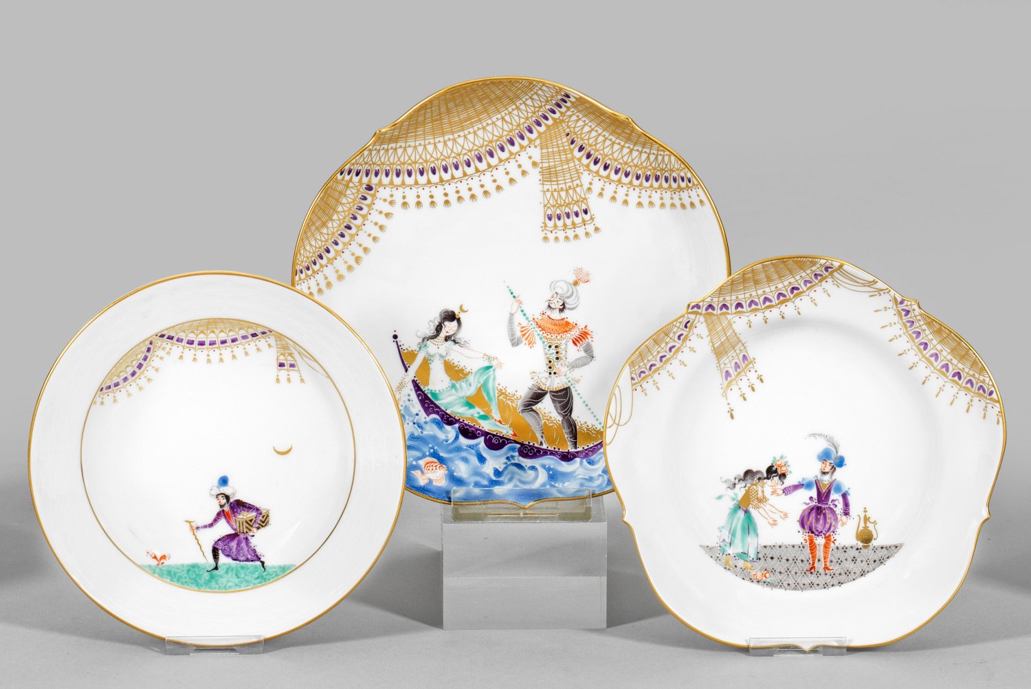 Geschweifter und glatter Rand, teilw. mit sog. "Gitterrelief". Szenische Darstellungen nach Vorbild der Erzählungen "1001 Nacht" in feiner polychromer Malerei mit reicher Goldstaffage. Form-Entw. Ludwig Zepner. Dekor-Entw. Prof. Heinz Werner. Schwertermarke. D. 16 cm - 18,5 cm.
