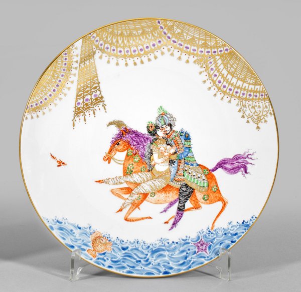 Runde Form mit glattem Rand. Im flachen Spiegel szenische Darstellung des Liebespaares Schahryâr und Scheherazade, über Wellenterrain mit Meerestieren auf einem Pferd reitend. Inspiriert von den persischen Erzählungen "1001 Nacht" in feiner polychromer Malerei. Oberhalb gitterartiger Goldspitzenbehang. Dekor-Entw. Prof. Heinz Werner. Schwertermarke. D. 26 cm.