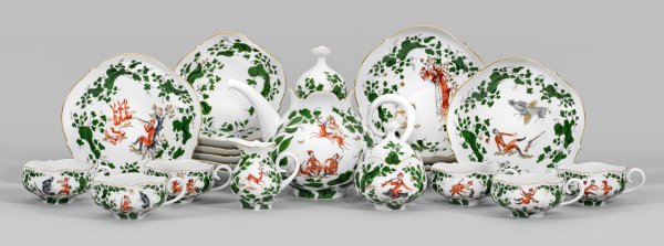für sechs Personen. 15-tlg.; Teekanne, Zuckerdose, Sahnegießer, 6 Teetassen mit Untertassen, 6 Kuchenteller. Form "Großer Ausschnitt". Auf der Wandung verschiedene, szenische Jagddarstellungen, u. a. von rastenden Jägern, der auf einem Hirsch reitenden Jagdgöttin Diana, Jägern mit einer Hirschkuh tanzend bzw. rücklinks auf einem Wildschwein reitend sowie auf Hasen oder Enten zielend. Begleitend Einzelmotive von Hirschen, Schmetterlingen und Vögeln. Polychrome Aufglasurmalerei mit gezielten Goldakzenten. Form-Entw. Ludwig Zepner. Dekor-Entw. Prof. Heinz Werner, um 1973. Schwertermarke. Kannen-H. 19,5 cm.