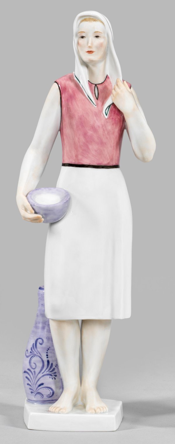 Auf unregelmäßigem Vierkantsockel, an einer Bodenvase stehende junge Frau, in der rechten Hand eine Schale haltend und mit der Linken ihr Kopftuch berührend. Polychrome Malerei. Entw. Elfriede Reichel-Drechsler, 1958. Modell-Nr. 73339. Unterglasurblaue Schwertermarke und eingepresste Weißwaren-Marke. H. 34 cm.