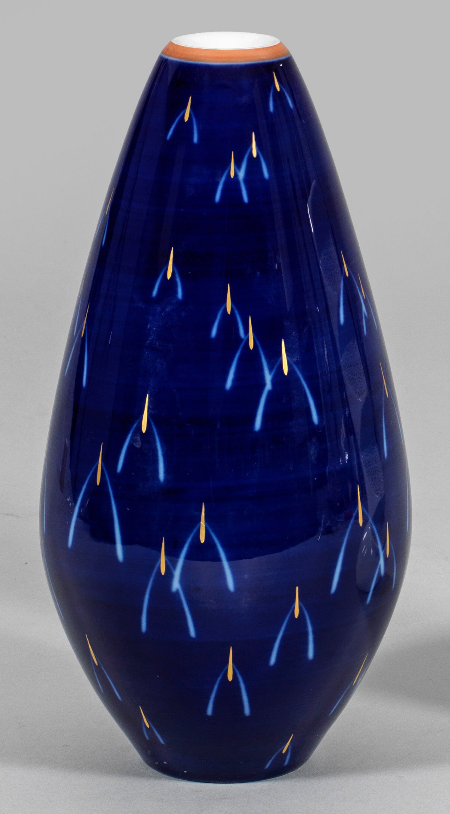 "Kolbenform". Kobaltfond mit Golddekor und Farbband. Form-Entw. Hubert Griemert, 1953. Dekor-Entw. Siegrid von Unruh, 1959. Dekor-Nr. 147/1028. Jahresbuchstabe. Zepter- und Malereimarke. H. 28 cm.