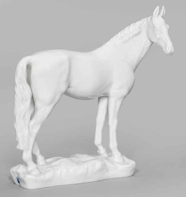 Weißporzellan. Auf rechteckigem, naturalistisch gestaltetem Sockel vollplastische Darstellung der Hessenstute Halla, die mit dem deutschen Springreiter Hans Günter Winkler mehrere Weltmeisterschafts- sowie Olympiasiege verbuchte. Entw. Jörg Danielczyk, 1978. Modell-Nr. 78859. Jahreszeichen. Schwerter- und eingepresste Weißwaren-Marke. H. 19 cm.