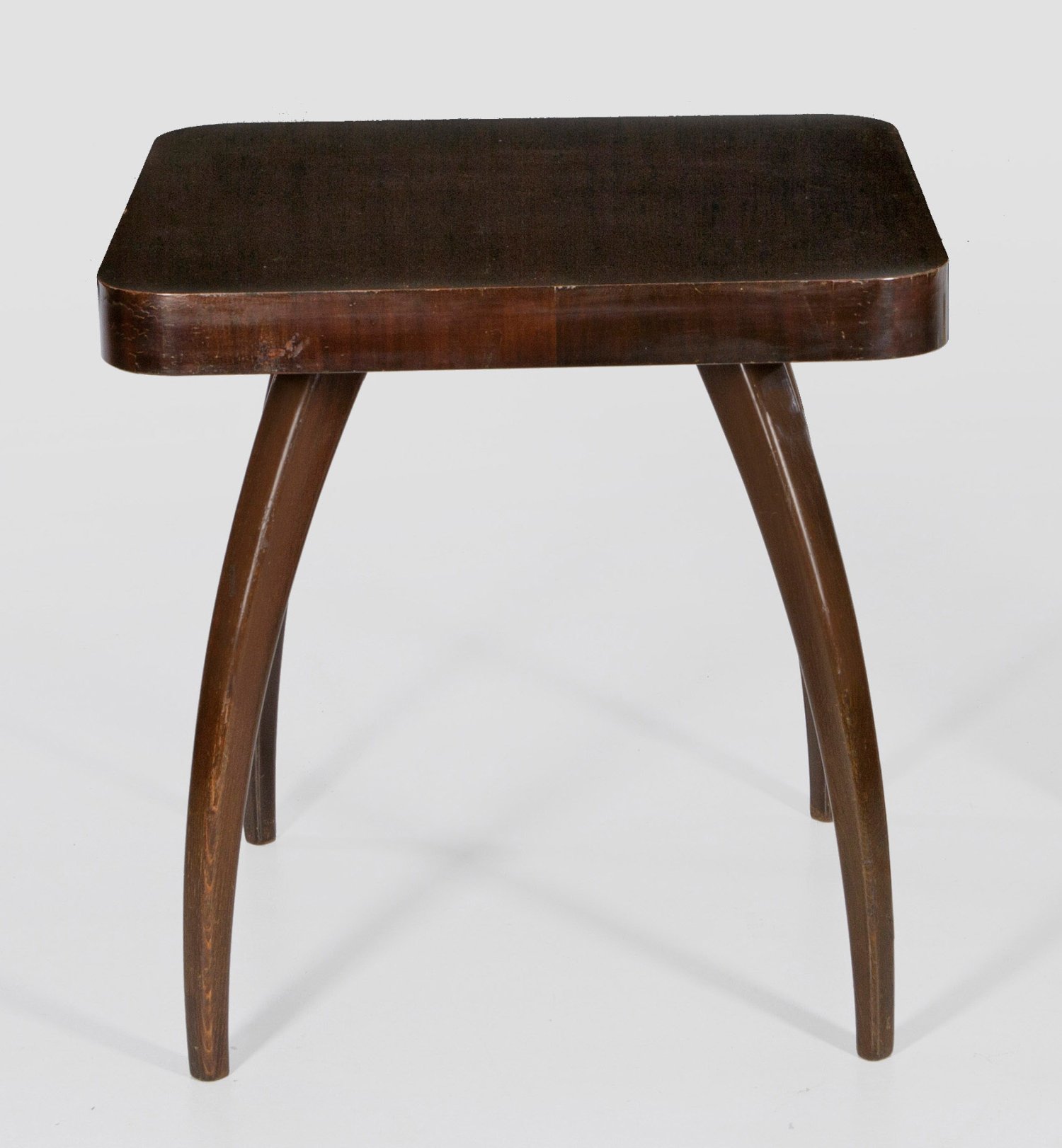 Modell H259. Mahagoni, furniert und Buchenholz, dunkel gebeizt. Sich konisch verbreiternde gebogte Streben als Träger für quadratische Deckplatte mit gerundeten Ecken. Unterhalb Reste eines Etiketts. Entw. Jindrich Halabala. Um 1930. H. 64,5 cm. 64,5 cm x 64,5 cm.