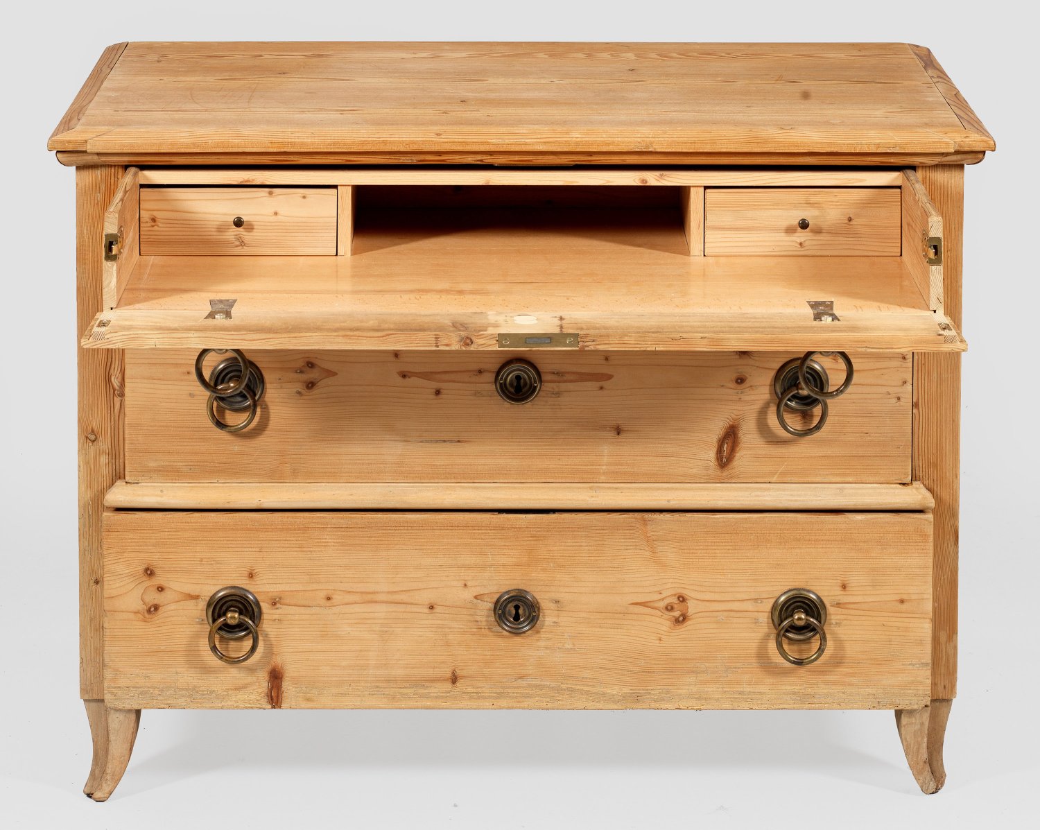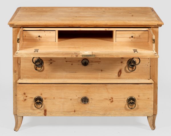 Kiefernholz. Gerader, rechteckiger Korpus auf leicht ausgestellten Füßen. In der Front drei Schubladen unterschiedlicher Größe. Die oberste abklappbar mit Facheinteilung. Gering überstehende Deckplatte. Rest. mit Erg.; H. 80 cm. 110 cm x 55 cm.