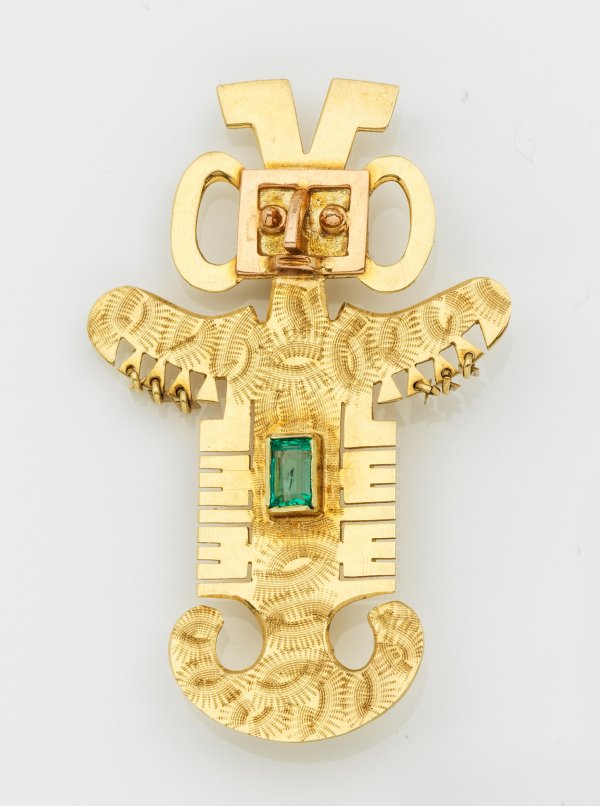 Pendant after Pre-Columbian jewellery by the Tolima culture, set with an emerald appeox. 0,50 ct., in 18 k gold. Certificate included.