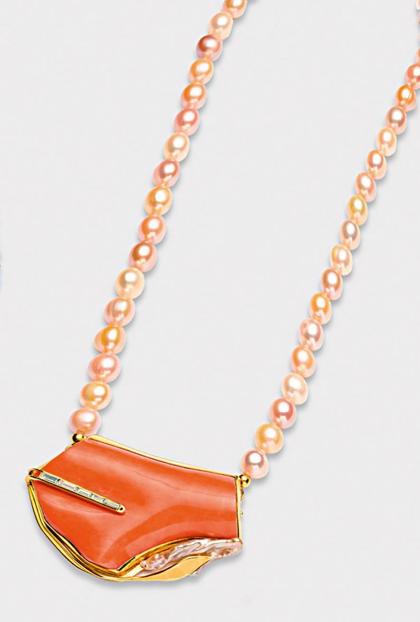Gelbgold, gest. 750. Anhänger besetzt mit lachsfarbener Koralle, akzentuiert mit Diamantbaguetten und hellbrauner Keshiperle, an sog. Harlekin-Süßwasser Perlenkette. Auch als Brosche tragbar.