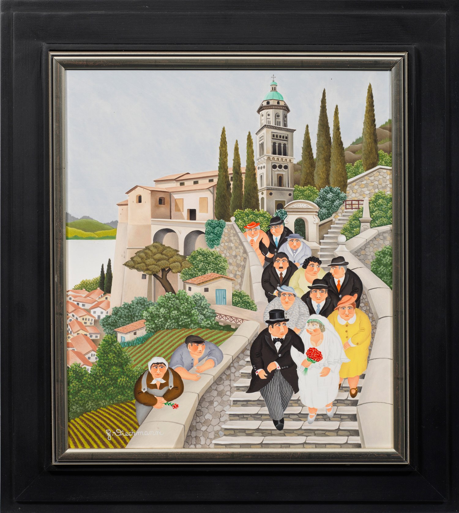 Eine illustre Hochzeitsgesellschaft zieht nach dem Gottesdienst von der Kirche ins Dorf, das malerisch am Hang eines norditalienischen Sees liegt. Charakteristische, naive Komposition des norddeutschen Malers, dessen Oeuvre von vielfigurigen Genreszenen geprägt ist. Öl/Platte. L. u. sign.; 40 cm x 35 cm. Rahmen.